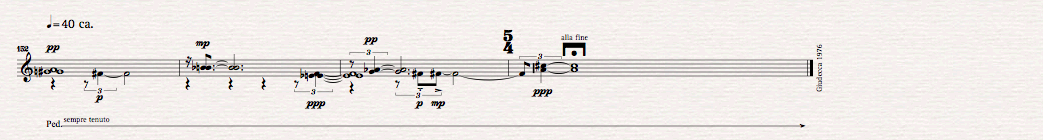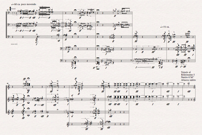 Module 3 conveys a complex analytical chart to …..sofferte onde serene…. It is intended for practitioners who are studying the piece (composers or performers), and it includes minute compositional details. It is made of four basic elements: (1) a graphic exposition of the score that renders visible the formal sections and subsections of the piece; (2) analytical diagrams focused on pitch and rhythmic structures/reductions; (3) audio recordings (piano alone, without tape) of every subsection; (4) denominations of the sections and subsections according to Luigi Nono (blue) or made by the author of this exposition (orange-red). Together, they allow recognition of some fundamental aspects of the score: (1) Form. A complex imbrication of sonata and variation forms, including an explicit ‘recapitulation’ after the climax, and ten implicit ‘variations’ on an underlying pitch structure. (2) Counterpoint. Use of imitative and canonic processes of writing. (3) Harmony. Use of ‘harmonic fields’, highly recognisable sound-aggregates with additive pitch processes; use of additive chord techniques, adding chords to one another but breaking their identity. (4) Use of rhythmic cells, small units that structure big sequences without serial/numeric controllers.