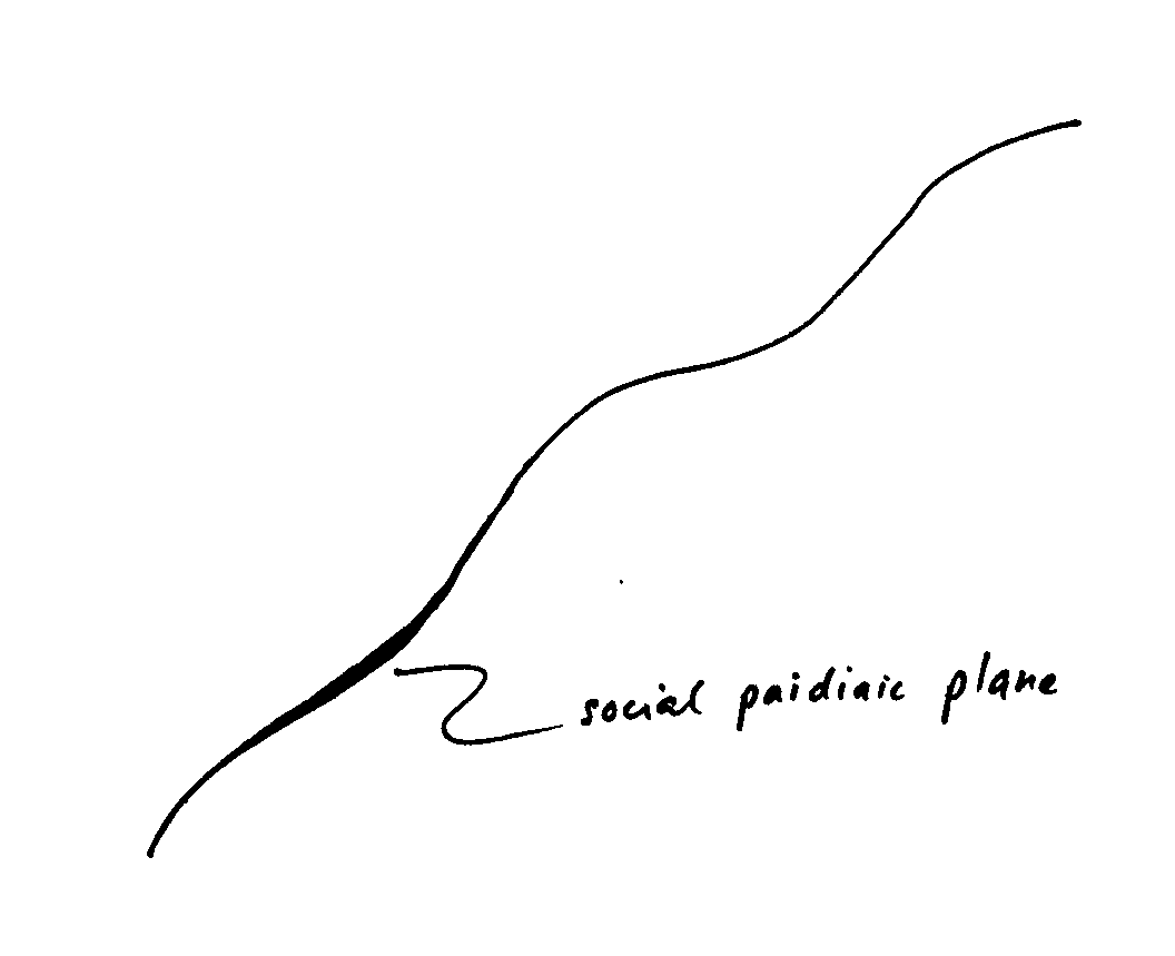 To describe the development and continuation of a research journey, or more specifically a design workshop, we could draw an action line. This line illustrates the progression of the journey. If everything runs smoothly, or too smoothly, and nothing much happens, the line is straight. Such a journey would be the ideal of rigidity, predictable and under control, arriving according to plan. But as we deal with other people, unexpected things happen and the line winds and twists. Sometimes this happens because of conflicts or insecurity, but most often simply because of interplay. If the participants have a great time and start to improvise and take their own initiative the line bends according to their steering. My best experiences from participatory workshops has happened when the right energy kicks in and the action starts flowing, like in a swinging jam session; players listen to each other, build upon each other’s scales and tones and trigger new improvisations. There is no leader, but leadership lies in the relay of initiative, where the scale allows all band members to play one solo after each other. This is the social paidiaic plane, it is the wave on which the paidiaic event surfs.