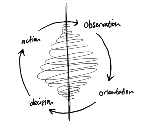 The OODA loop describes the process from observation to action, and the crucial advantage of the fighter who goes through the process faster than his enemy and thus gets inside the opponents loop, making him act upon outdated observations. As Boyd briefly put it in “New Conceptions for Air to Air Combat”, a 1976 briefing: ‘He who can handle the quickest rate of change survives’ (Coram 2002: 328).
