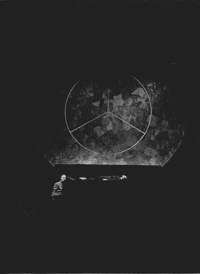 The voices of the Sami and the Hebrew-speaking man were mixed with fragments of authentic speeches by Hitler, Mussolini, and Khrushchev. The section ends with the roaring of a crowd, stereophonic transmission giving the impression that the sound web is surging across the stage.