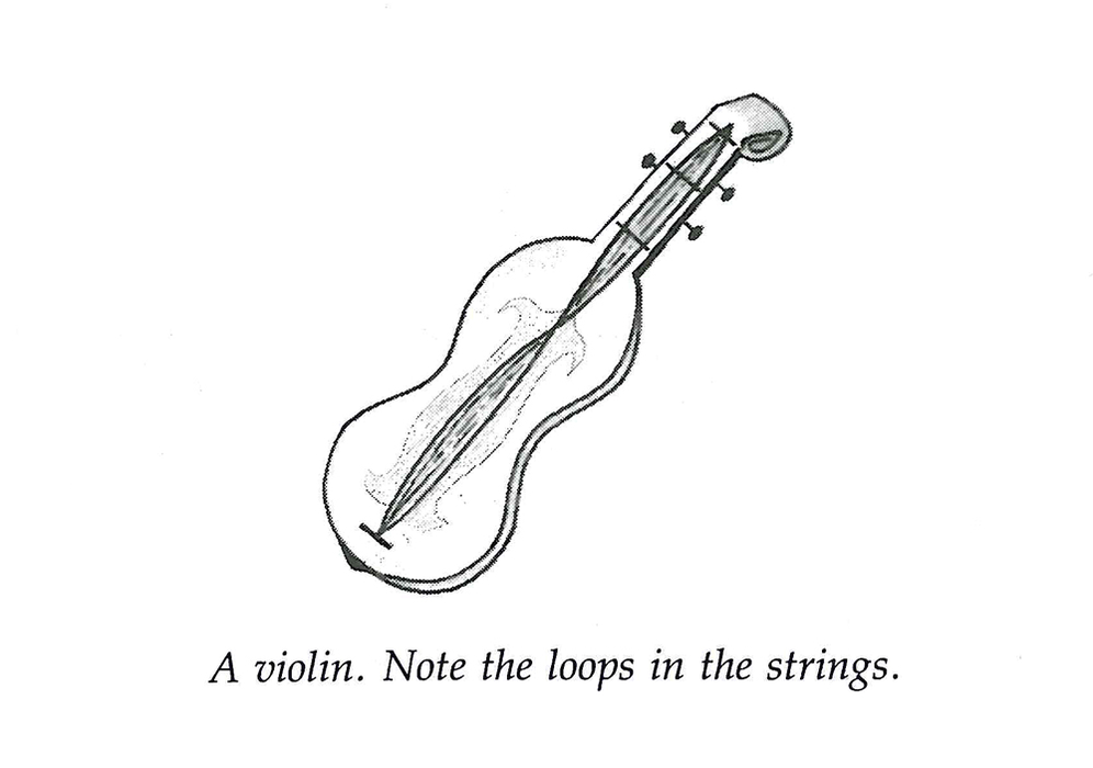 Figure 2: An early illustration from a popularization (Parker 1987: 249), making the comparison with violin strings, whose “loops” illustrate the modes of vibration of strings.
