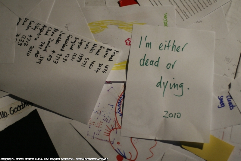 This proved a particularly popular section and prompted a variety of uses. Over the course of the event more and more text was generated, covering a variety of types: lists, stories, confessions, etc. A common use of the space was for visitors to sit on the edge of the pit area and read through what others had written. Occasionally these texts would be read out over the microphone or recorded onto the dictaphones. At the end of the second evening, Kieran Hurley, a previous collaborator, instigated a reading of everything that had been written, one text after the other. This lasted for around half an hour until the end of the event.