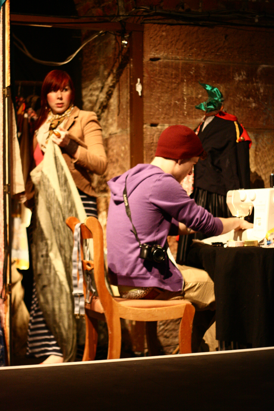 For health and safety reasons only our costume designer Christine Halsall was permitted to operate the sewing machine, but on one occasion this rule was broken when a textiles student created a t-shirt, which was subsequently displayed on the mannequin for most of the event. The costume station was not used extensively, but there were several occasions when people dressed up and made costumes. Home made t-shirts were also added to the rail, with various pictures and slogans.
