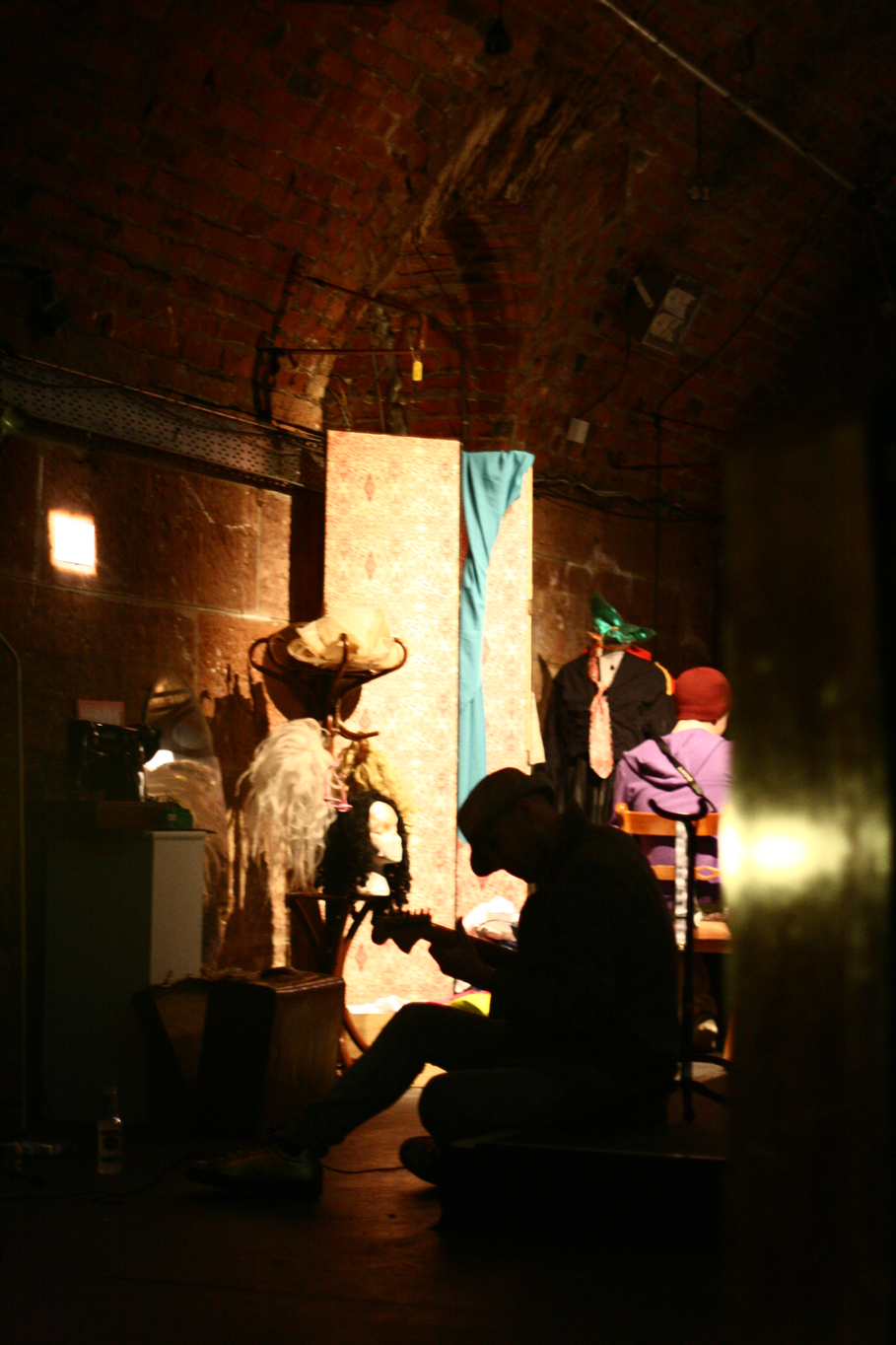 Visitors to the space encountered an ‘Aladdin’s cave of resources’ [2], centred around six interactive stations (light, sound, titles, text, costume and computer). Musical instruments, effects machines, projections, sound and light equipment, and various texts filled the space, and these were all available for visitors to use in a variety of undetermined ways. This set up intended to present an open space with the potential for a range of different modes of engagement and relationships with the artwork, the space and its users.