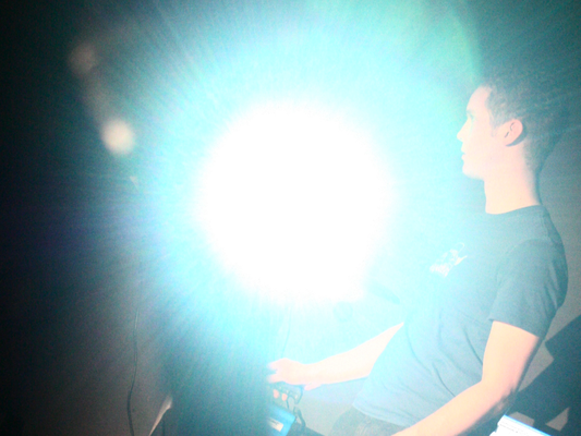 As well as the professional theatre lighting, a number of torches and lamps were available to be moved around the space. The lamps could be plugged into points around the room, and had adjustable heads with their own dimmers attached, so that light could be arranged in various directions and levels of intensity. A range of different lighting states was used, and often when a tangible theatrical performance occurred (if somebody spoke into the microphone or played a guitar for example) others would direct lights towards them, creating temporary ‘stages’ around the room. The lighting also worked with other elements of the space; a torch shone through smoke or a moment of darkness while solemn music was played. This was one of the key areas where visitors to the space worked together to create the overall aesthetic. The simple operation of lighting using the lamps had the potential to significantly affect the atmosphere in the room, yet afforded the anonymity of an operating position removed from the areas where theatrical performances were occurring. Perhaps for this reason moving and controlling the lamps was one of the most popular uses of the space, even though few visitors operated lighting from the desk.