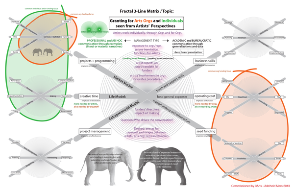 Also included here is a commission from the 3Arts Foundation in Chicago to gauge artists's perceptions of granting frameworks. It was also presented at the 2013 Grantmakers in the Arts Conference. A custom print of the diagram on a whiteboard is now part of the 3Arts collection.