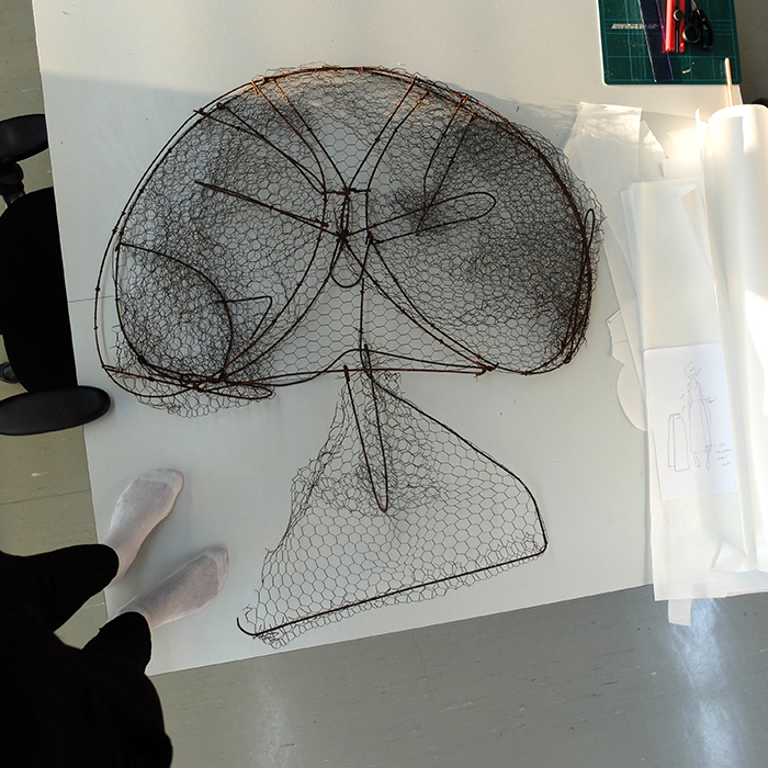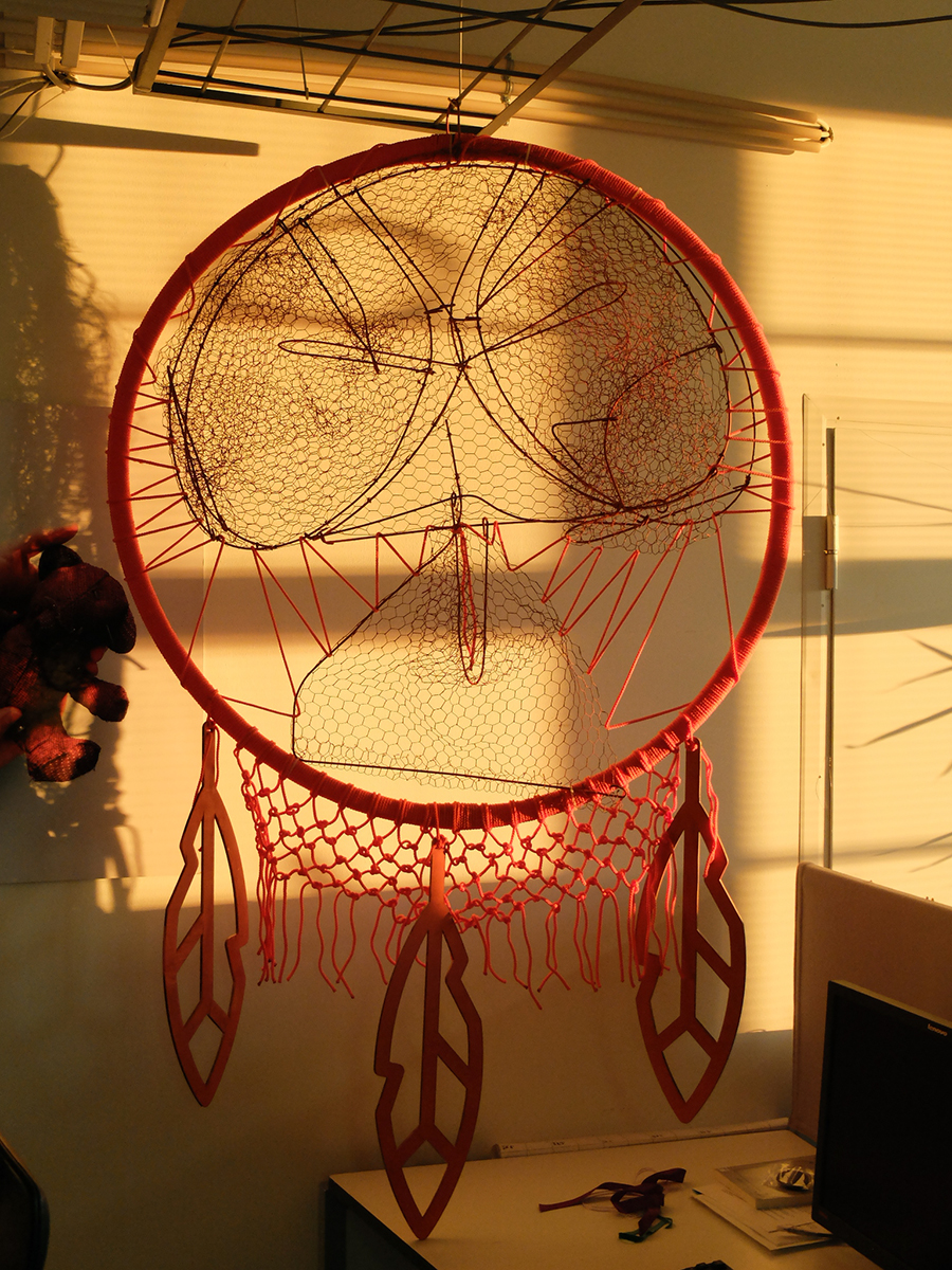 In order to use the trap as a part of the artefact, it first had to be cleaned and flattened. Because of the weight of the trap and its large size, I could not follow my original plan to hand it below the main circle of the dreamcatcher, but had instead to use the trap as the central element. This compromise had an upside: the silhouette of the trap reminded a stingray or a jelly fish and was easily associated with water. To finalise the object, I added the net and some stylised feathers, and chose a bright orange colour to make it appear brighter among the trees.