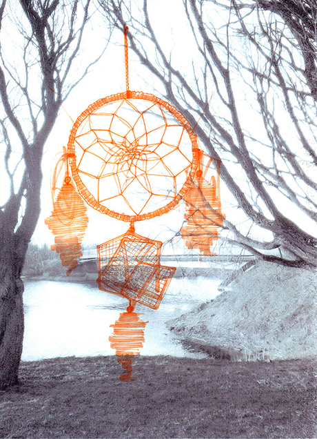 My first urge was to create a big version of a native-american dream catcher and place it near the river.