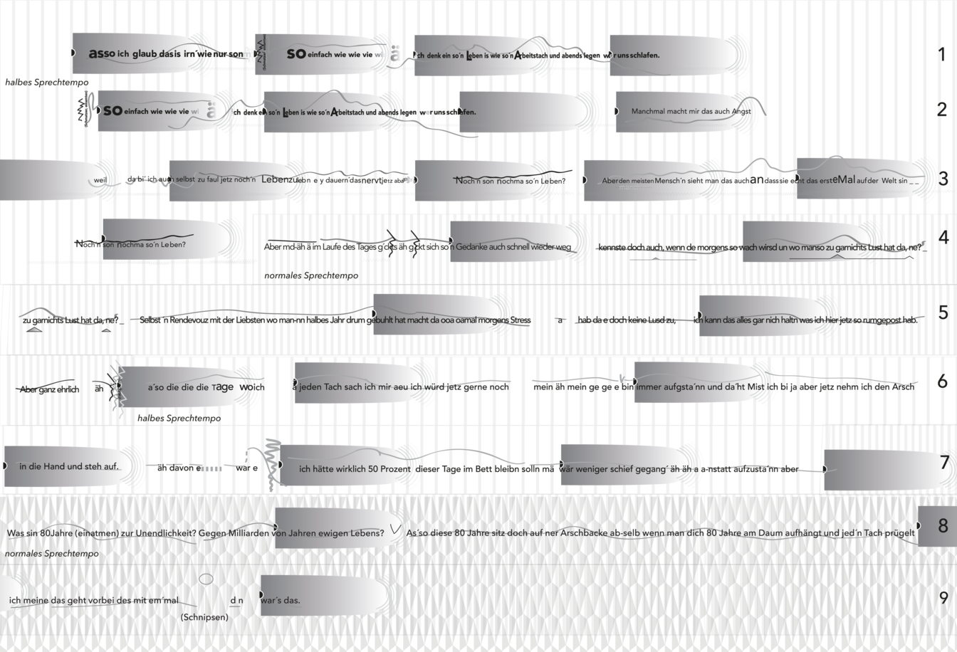 In der letzten Arbeit mit der Gruppe huRRa!! wurde dabei der Umgang mit dem Material so grundsätzlich, dass das entstandene Theaterstück “Black Hole Theatre” die Bezeichnung O-Ton-Theater bekam: Ein szenischer Ablauf mit drei Performern, für den eine Textfassung aus O-Tönen zur Grundlage wurde. Dabei fungierte der O-Ton als beständige Referenz und wurde, einer Partitur gleich, in all seine Bestandteile aufgeschlüsselt: Dynamiken, Tempi, Phrasierungen etc (siehe Arbeitsprobe “Black Hole Theatre”). Schnell wurde dabei klar, dass das Sprechen auf der Bühne in eine gesangliche Qualität überführt werden konnte: Die Performer beharrten in der Darstellung der Figur auf der Materialhaftigkeit ihrer Vorlagen. So entstand der Eindruck eines auf der einen Seite “fremden” Sprechens - da diese Form des Sprechens sehr vom genuinen Bühnentext abweicht und der Körper des Performers mit dem gesprochenen Material in ein Spannungsverhältnis tritt. Auf der anderen Seite ist dieses Sprechen dem Zuschauer bzw. Zuhörer aber auch sehr vertraut. Denn anders als bei der Bühnensprache liegen emotionale Ebenen nicht in einer begrifflichen Erfassung, sondern vielmehr in der Vielzahl der Zwischentöne, die die Aufname fixierte: Ein zu langes Zögern am Ende des Satzes, ein kurzes Stottern bei der Wortwahl und natürlich die große Bandbreite an Füllworten, wie “Oh”, “Ah”, “Hm” etc., die in dieser Konstellation eine Aufladung erfahren, wie sie in der Erarbeitung eines Bühnentextes durch Regie und einem Sänger oder Schauspieler nie möglich wäre.