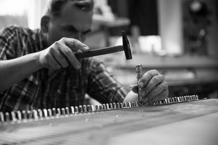 For music instrument makers it is not always easy to innovate. Players may be reluctant to try out newly designed instruments, or the knowledge on instrument making may have been the same for over 150 decades. Piano builder David Klavins developed his own approach towards piano building by experimenting with old pianos. His approach aims to create a softer and warmer sound than conventional pianos, based on the idea to use a single string per hammer - the una corda principle.