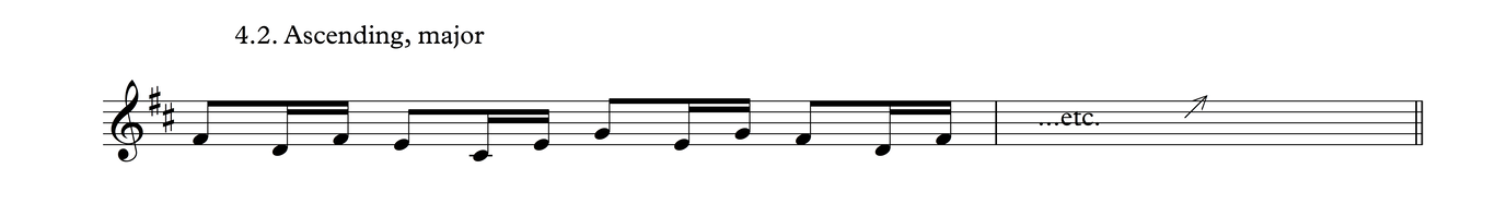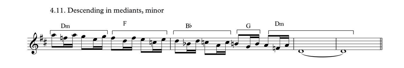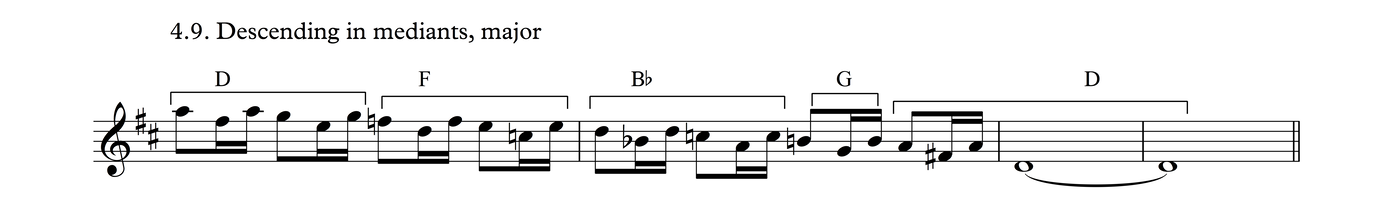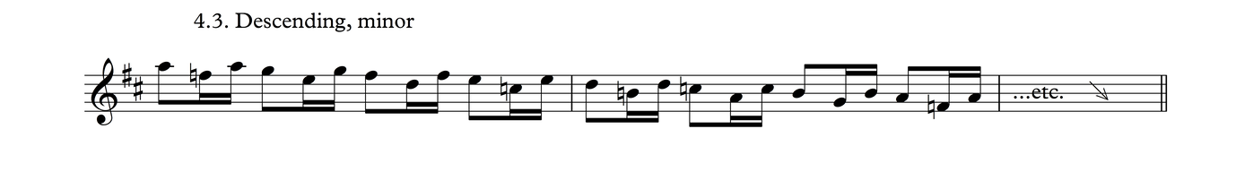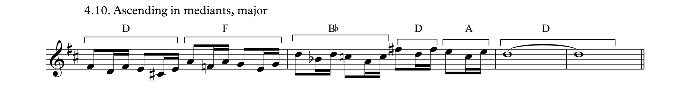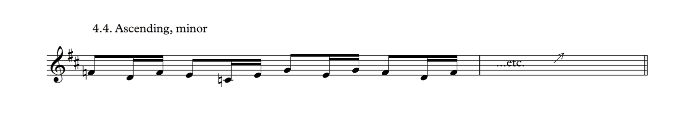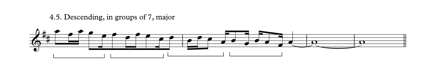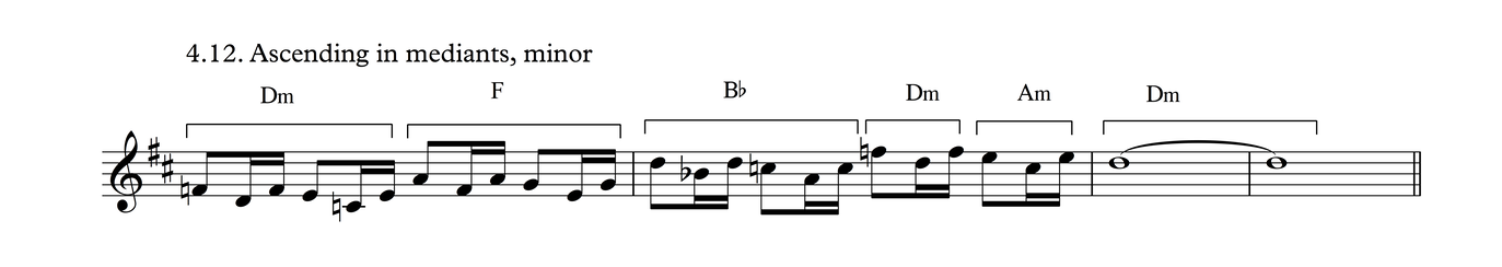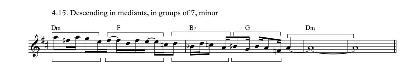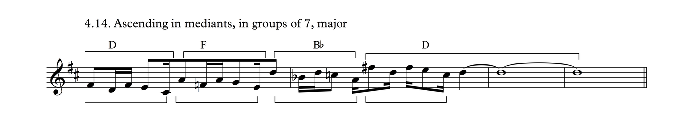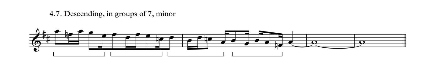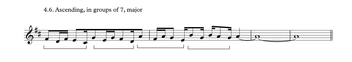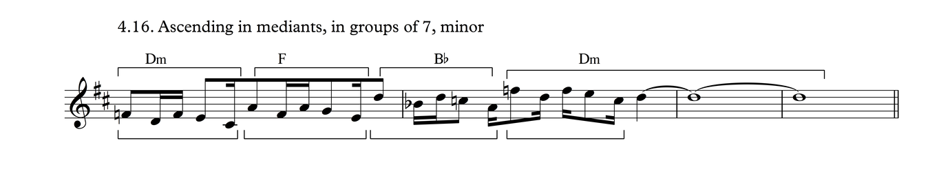 This particular melodic profile is very common not just in this time signature, but also as triplets over 3/4, as we shall see in Process 5. The development of this phrase follows the same layout as Process 3.