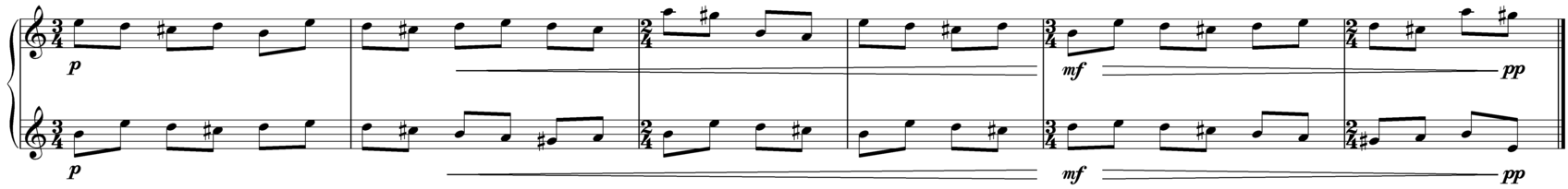 Figure C below is an accompaniment motif with melodic qualities. It was conceived as a kind of multi-accompaniment that could support, if dramatic demands called for it, all three melodies discussed in this section. Likewise, it contains a number of intentionally subtle rhythmic distortions, such as the syncopated E pedal (which likewise reinforces the E Mixolydian character), the syncopations in the opening E-D-C# - which are corrected two bars later from the last beat of the third bar – and the near-repetition with a slight rhythmic variation on the fifth bar.