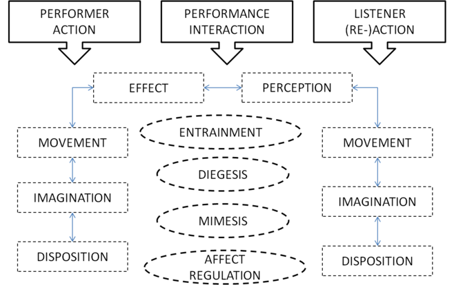 This dual method ultimately was synthesized in a topical attractor model where action, interaction and (re-)action operate as the main-attractors in a chaotic field of information. They represent the basic human capacities that enable musical experience and are situated at the top of an inverted tree-model that harbours various levels of sub-attractors and prolongations. A first line of sub-attractors related to ‘action’ consists of ‘disposition’, ‘imagination’, ’movement’ and ‘effect’ and the attractor ‘interaction’ is in a first instance further developed in terms of ‘entrainment’, ‘diegesis’, ‘mimesis’ and ‘affect regulation’.