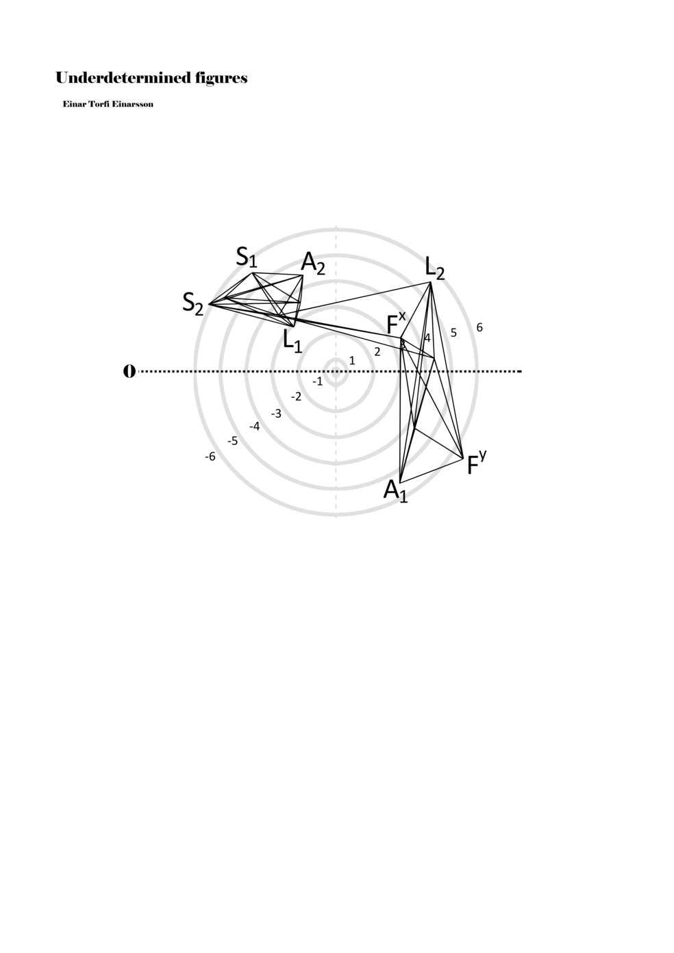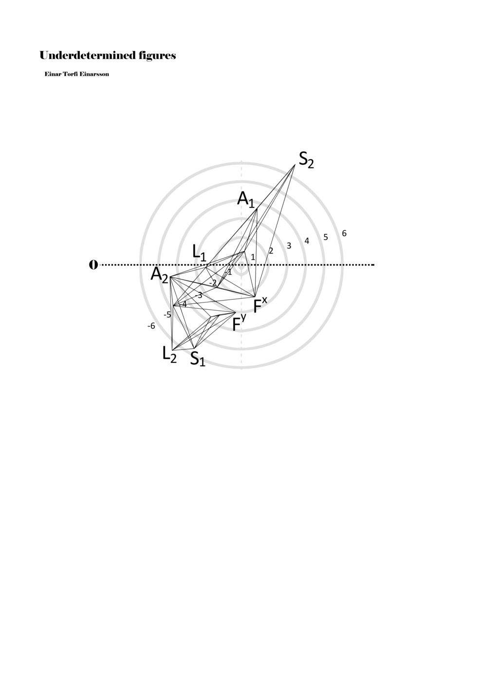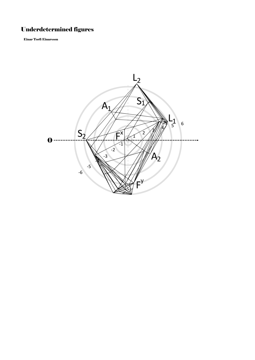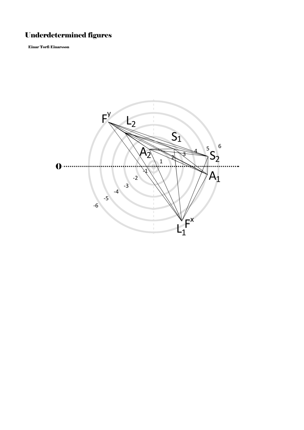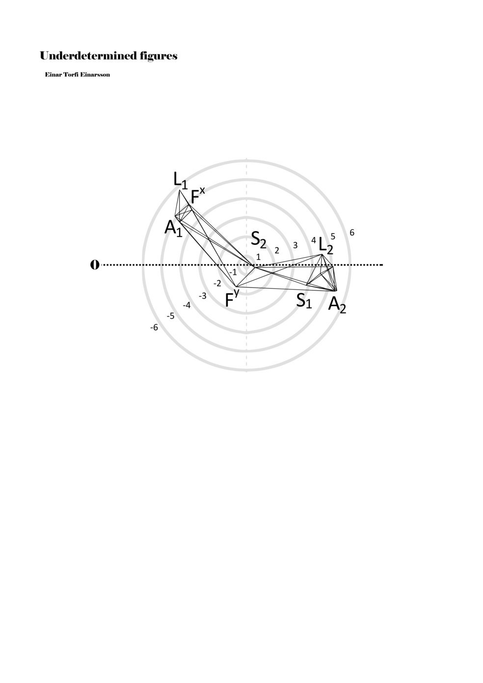When a figure is placed within this parametric space one can thus read all kinds of changes in value when following the lines in any direction (paths). These number rows are then assigned specific physical parameters, which then operate as instructions for performers. In example 2 we see one figure placed within the field. Indicators (F, L, A, S, see details below) denote starting points (or the initial ‘posture’ of the performer) – that is, where a given parameter initiates when performing the figure. A path is chosen by the performer for each indicator/parameter but from each indicator there are several possible paths and only one path is chosen. The rule is, follow a line from the indicator to the next point (where lines join) in the figure. So, for each parameter there is a line from the indicator to the next point (or node) resulting in a change in value for that parameter. Importantly, when performing the figure all parameters are active, so the performer aims to perform all the chosen paths simultaneously. In example 2, Fx (force) initiates around -3.3 and can proceed through several paths to another point: -2, -1, +2, or -2.8, and so on. The same goes for the other indicators. Each figure is therefore a set of paths indicating a change in certain parameters, and all these paths are played simultaneously for the duration of the figure (each figure is always performed for around 2–3 seconds).