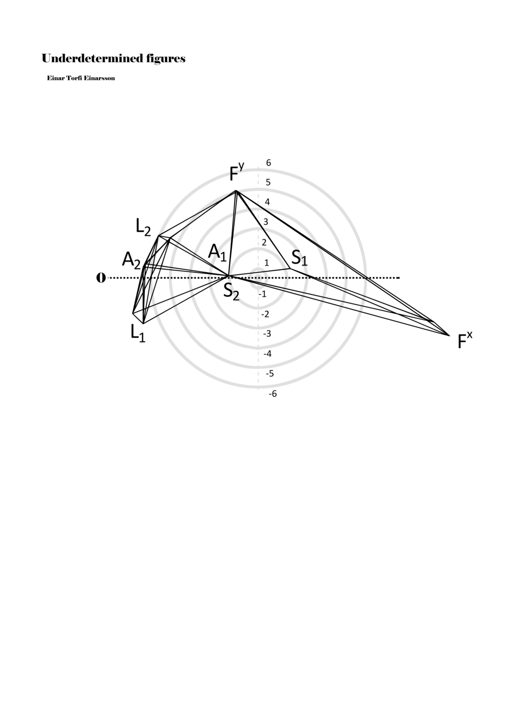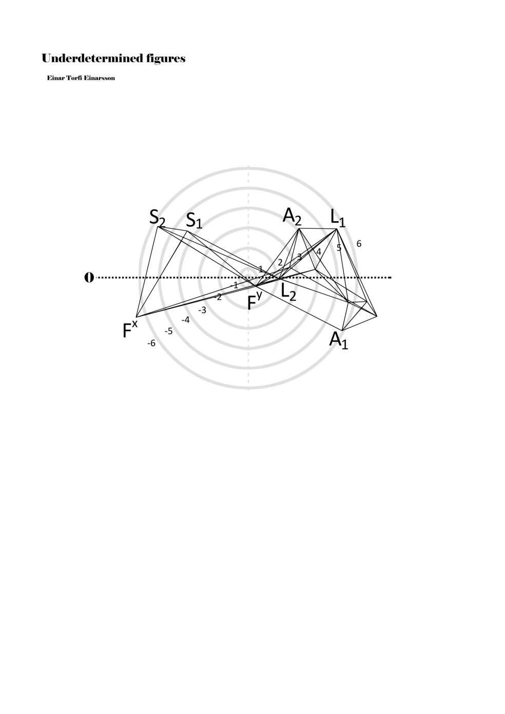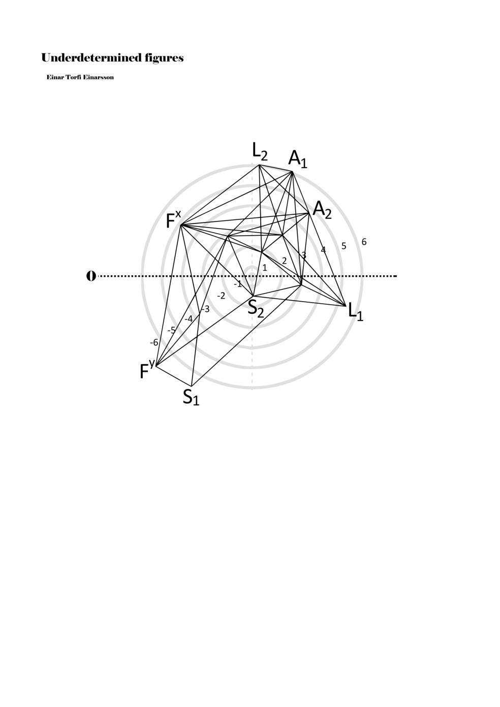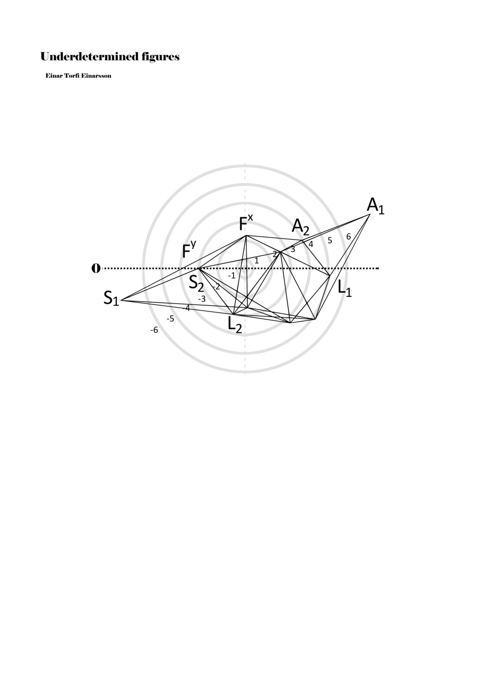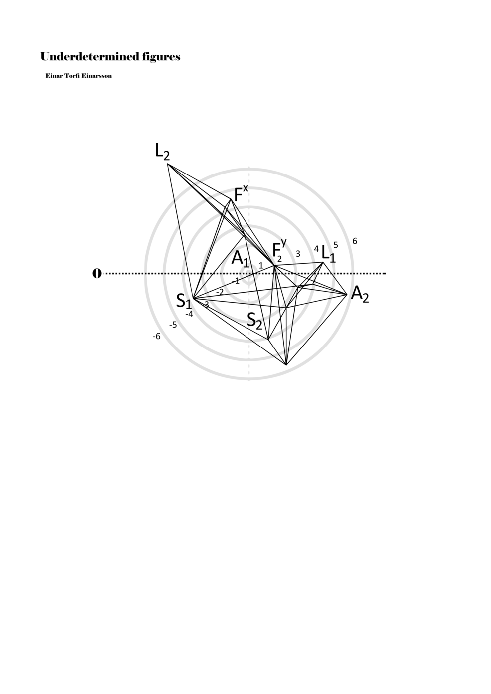 When a figure is placed within this parametric space one can thus read all kinds of changes in value when following the lines in any direction (paths). These number rows are then assigned specific physical parameters, which then operate as instructions for performers. In example 2 we see one figure placed within the field. Indicators (F, L, A, S, see details below) denote starting points (or the initial ‘posture’ of the performer) – that is, where a given parameter initiates when performing the figure. A path is chosen by the performer for each indicator/parameter but from each indicator there are several possible paths and only one path is chosen. The rule is, follow a line from the indicator to the next point (where lines join) in the figure. So, for each parameter there is a line from the indicator to the next point (or node) resulting in a change in value for that parameter. Importantly, when performing the figure all parameters are active, so the performer aims to perform all the chosen paths simultaneously. In example 2, Fx (force) initiates around -3.3 and can proceed through several paths to another point: -2, -1, +2, or -2.8, and so on. The same goes for the other indicators. Each figure is therefore a set of paths indicating a change in certain parameters, and all these paths are played simultaneously for the duration of the figure (each figure is always performed for around 2–3 seconds).