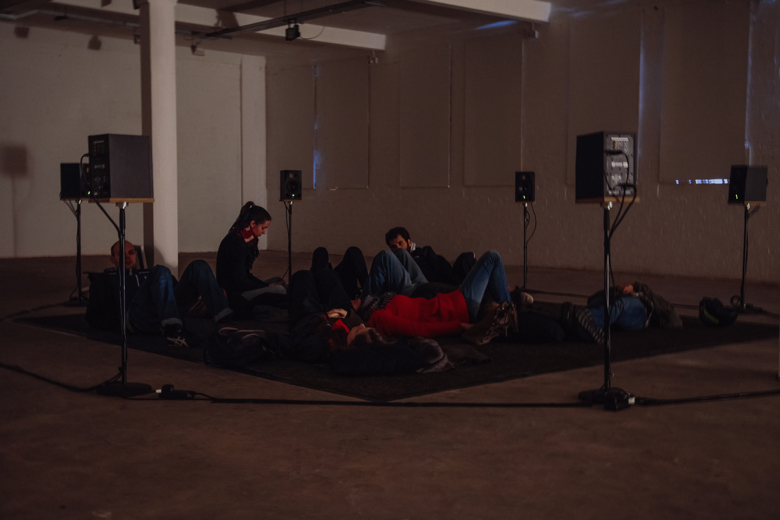The installation was another example of sound art encouraging playful encounters with the everyday urban environment. Taking Meireles’ recording and physical tagging of electricity boxes in the public realm[29] into a contemporary art gallery, Negrão’s work was installed as a multi-channel loudspeaker array, forming a small circle around the listener. This sonic “sculpture” played with notions of urban listening and the spatiality of sound. The ring of loudspeakers delineated, within the larger gallery space, an intimate, immersive “room” and the visitor was implicitly invited to cross the threshold and lie down, a ritualized act optimizing their attention to the unfolding of the work.