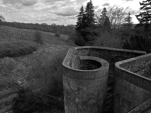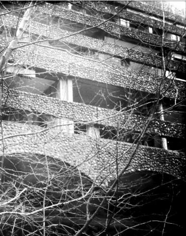 In the photograph St Peter’s Seminary (on the Artworks page), a figure squats low to the ground with another figure draped over her. Together they form a larger mass perched on slender anatomical supports similar to the way that the bulk of the main building was built atop stilts. They are located in the former refectory in the gap that existed between the seating area and a wall of windows. The air temperature in this formerly enclosed area would have been low due to its proximity to such large north-facing windows. The woman in the fore gazes out from what was an underdetermined space of the building. She would likely have been faced with her reflection if the glass were still in place, ensuring her knowledge of the second figure behind her. However, the glass is long gone and her reflection now appears in the rainwater-filled pool between herself and the viewer. Does she look in the direction of the former window in search of the displaced reflection, without an understanding of the building’s current state? Or might the reverse be true: does she turn away from the mirroring surface of the water? Is the second figure a burden being denied, or might the figure in the fore admire this configuration if she were able to locate her reflection?