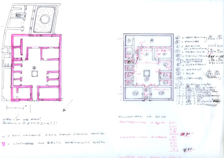 Since Pompeii I know: when you roll out your tape measure, the house is yours. By establishing the measures of a house, you make it your own. The door openings, the reconstructed heights, the windows, the now hidden evidence of where all sorts of things were in the house – traces of earlier archeological study invite further investigation. But at this point the artist in me awakens: I want to see it, make it, translate it according to my own standards. Even before having studied Penelope Allison's book on the subject, I had outlined my scale-model already, resulting from my own measurements. After half a year I called in an expert, and now I know that I could not have done otherwise in order to arrive at a proper interpretation of the Casa della Caccia Antica. Although this interpretation is now based on my own observations and measurements, it would have been different if initially I had had more knowledge available. This not-knowing I experience as valuable if not crucial – as artistic freedom in my design process, as a blankness that allows me to explore and develop my own options and visions. Most fortunately, though, after consulting the work of Allison my observations of the house proved correct, a few details excepted. But I also made a mistake: the door openings closed off with mortar and later rediscovered (from atrium to cellae and vice versa) were closer to the vestibulum/fauces. This means I have to render this entrance space slightly smaller. Yet this will only improve my design, in fact, also because it reveals more strongly the correspondence with the entrance areas of the Etruscan tumuli. What is at least as interesting, in my view, is my decision to put small windows on the west side of the house. Now I know that Roman law allowed placing windows that look out onto undeveloped land. There were in fact small windows on the west side, which were later sealed off with mortar when the adjacent property was built. Likewise, the slave quarters, which initially I removed intuitively, were actually built later, to fill up the undeveloped land on the eastern street side. How wonderful to be able to rely on your intuitive notions and to be able to believe what your eyes can see! (Note in the margin, 31 May 2011)
