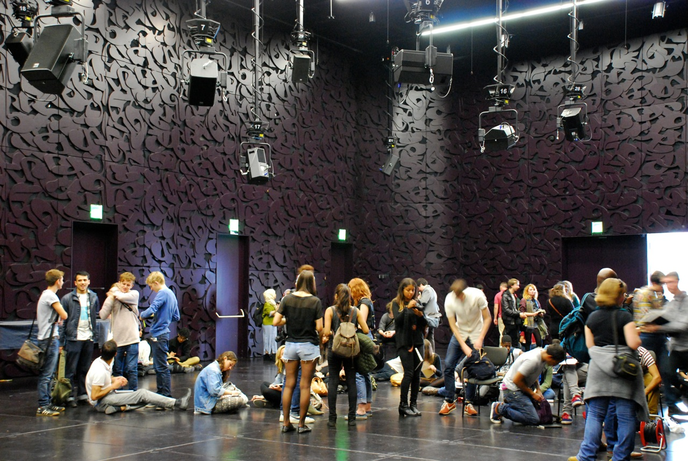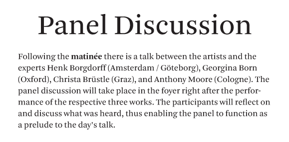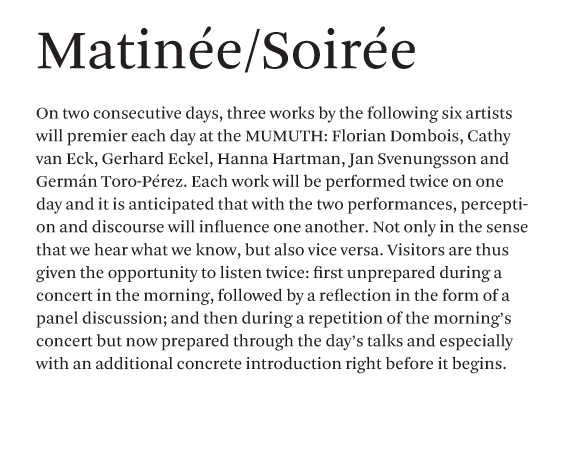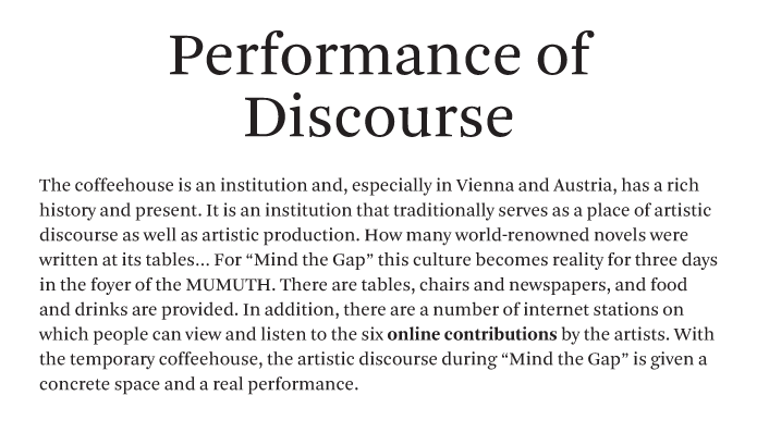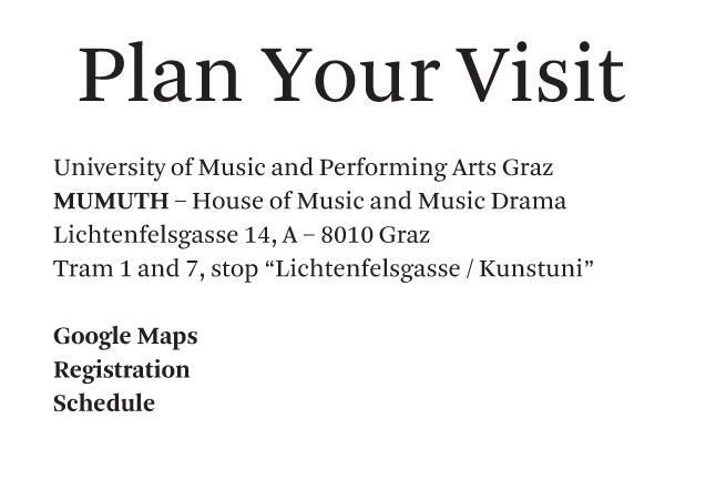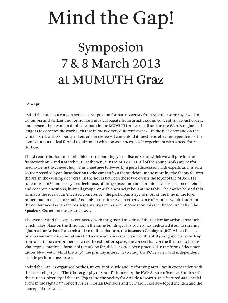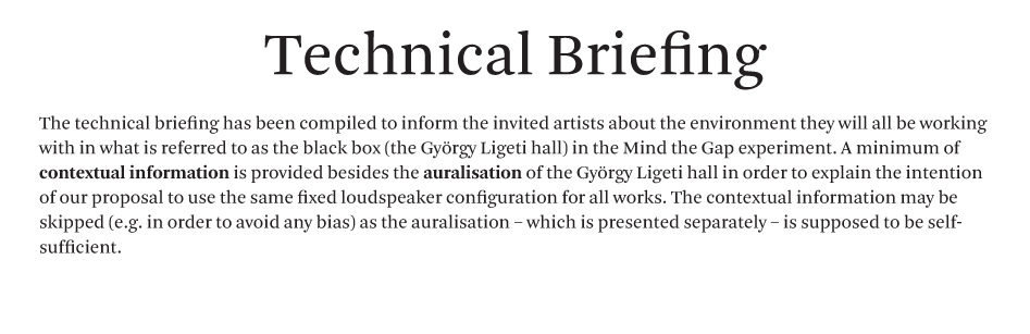 "Mind the Gap" is a concert series in symposium format. Six artists from Austria, Germany, Sweden, Colombia and Switzerland formulate a musical bagatelle, an artistic sound concept, an acoustic idea, and present their work in duplicate: both in the MUMUTH concert hall and on the Web. A major challenge is to conceive the work such that in the two very different spaces – in the black box and on the white board; with 33 loudspeakers and in stereo – it can unfold its aesthetic effect independent of the context. It is a radical formal requirement with consequences, a self-experiment with a need for reflection.
