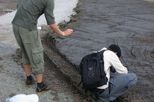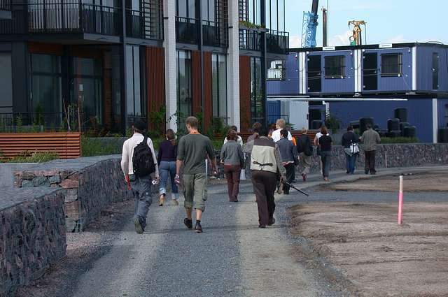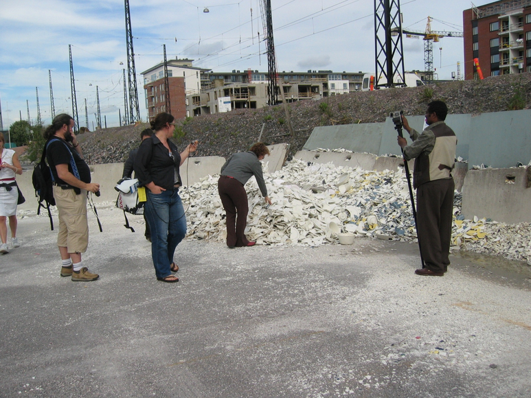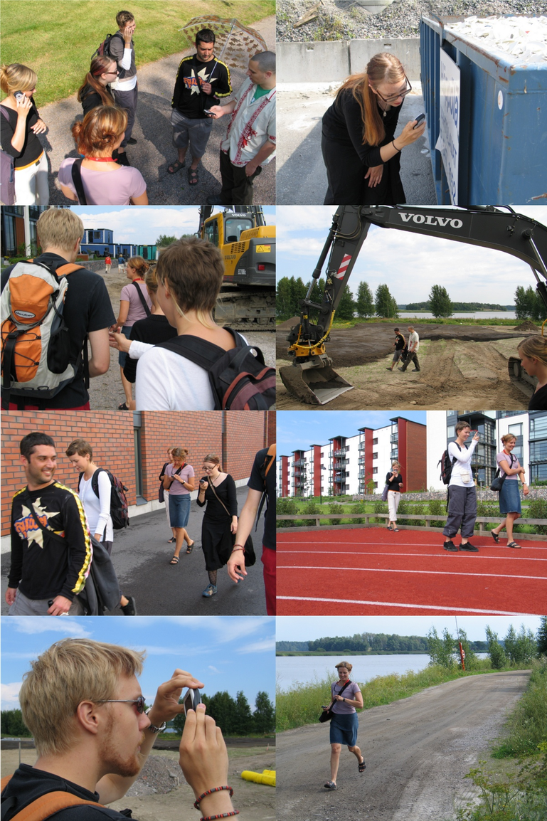 The location of the ISEA2004 'Wireless Experience' -themed Symposium in Helsinki, as already mentioned was University of Art and Design Helsinki, in the emerging Arabianranta neighbourhood, north-east of the city centre. The area is named after the famed ceramics factory in which the University is now based. Furthermore, because of the applied art and design heritage of the area, as well as the contemporary academic associations, and early high-speed broadband access to the area, it had a reputation for combining art and design with new IT communications technologies. A special feature of the neighbourhood development was the requirement by all housing developers to include 1-2% of their budget towards the production of public art works. There was an association to creativity and a newness about the area, with a perceivable sense of a place in transition.[19] Based on this context and assemblage of factors, our plan to take symposium participants outside the conference and seminar rooms seemed rather appropriate. During the summer of 2004, the neighbourhood was in partial construction and development with heavy machinery still around, with semi-finished tram-rail and ground surfaces in certain areas. All these features proved to be inspiration later [See figure 7].