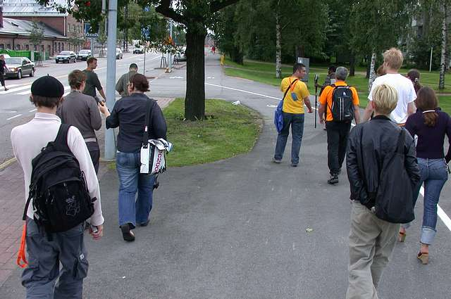 Figure 13. ISEA2004 audience members follow us re-walking the 'Arabianlenkki' renga walk route on the 21st August.