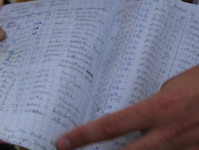 Figure 22. From the media produced and archived on the 'Arabianlenkki' renga session on August 11th 2004, selected highlights were extracted and presented to the audience on the ISEA2004 guided-tour walk on August 21st. A map of the devised route was sketched out, with note of highlighted media files that we had agreed to share with the audience members. Within the sketch, meta-data helped to identify, including unique ID, time in minutes and seconds, shared typed context keyword, and the sender. These video-clips and meta-data can be viewed further below.