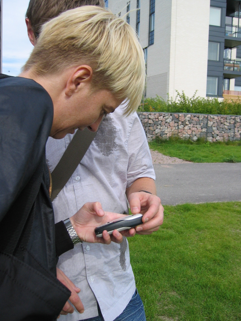 1. Standing still as a group. One or two persons (producer or workshop participant) took the responsibility to tell. The rest of persons present were mostly listening. These highlighted 'situations' in the presentation inform the audience of certain situated interactions and processes at that particular site, or appropriate to the narrative presented. Sequenced video-clips from the 'Arabianlenkki' renga walk of 11/08/04 were handed round on mobile devices according to the location of the highlight.