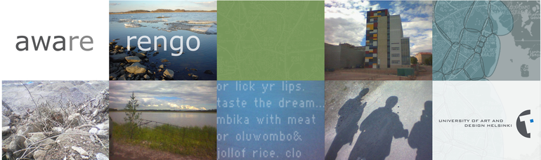 The 'Aware: Rengo' production process was, at the time 2004-2005, one of the most 'media-rich' projects I had been involved with up until that point, producing several gigabytes of media files, images and video documentation. We produced digital photographs, mobile audio and video-clips produced during the workshop sessions by ourselves as a workshop group. We also created digital photographs documenting our experimental exercises, social contexts of gathering, as well as digital photo and video documentation of what we called the 'Arabianlenkki' renga walk by Markus Ort and Kebede Mergia respectively. We were also using 'Aware' platform to archive our mobile media online, and gather the related meta-data about it on a server. During the ISEA2004 guided-tour presentation itself, more media documentations were made by both our production team, as well as several audience members.