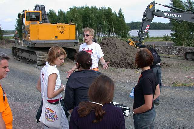 The location of the ISEA2004 'Wireless Experience' -themed Symposium in Helsinki, as already mentioned was University of Art and Design Helsinki, in the emerging Arabianranta neighbourhood, north-east of the city centre. The area is named after the famed ceramics factory in which the University is now based. Furthermore, because of the applied art and design heritage of the area, as well as the contemporary academic associations, and early high-speed broadband access to the area, it had a reputation for combining art and design with new IT communications technologies. A special feature of the neighbourhood development was the requirement by all housing developers to include 1-2% of their budget towards the production of public art works. There was an association to creativity and a newness about the area, with a perceivable sense of a place in transition.[19] Based on this context and assemblage of factors, our plan to take symposium participants outside the conference and seminar rooms seemed rather appropriate. During the summer of 2004, the neighbourhood was in partial construction and development with heavy machinery still around, with semi-finished tram-rail and ground surfaces in certain areas. All these features proved to be inspiration later [See figure 7].