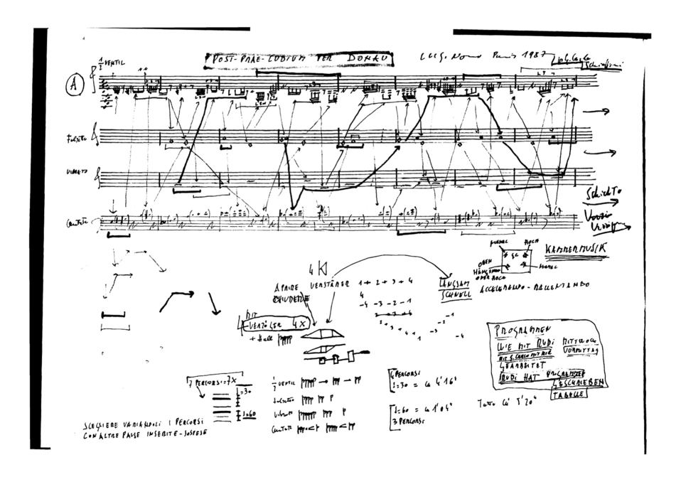 The creative process for Post-prae-ludium was somewhat similar to the one of A Pierre. Intended as the first of a series of pieces for solo instruments and live electronics written by Nono for (and with) his close collaborators, it ended up being the only one of these works ever officially finished.