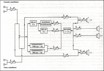 The second source of feedback – an additional challenge for the electronic performer – comes from the use of band-pass filters to modify the first wave of repetitions. The schematics for the piece indicate that the incoming direct signal of each instrument’s microphone must be routed to the opposite speaker (so that the direct amplified sound of the flute comes from the speaker behind the clarinet and vice versa). In performance, this adds an extra layer of confusion, which makes controlling the feedback induced by the heavily filtered repetition entering the microphone (and going to the opposite front speaker) extremely difficult.