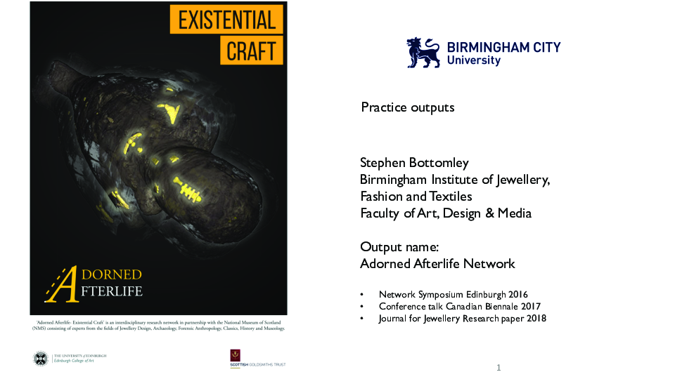 The Adorned Afterlife network was established by Bottomley in 2015 with a University of Edinburgh’s Challenge Investment Award. Bottomley brought together a network of international researchers from Design, Archaeology, Forensic Anthropology, History and Museology to examine hidden objects of adornment and share discourse and analysis through high-quality speculative multidisciplinary research. (see Appendix 1 and the Adorned Afterlife website, ‘’Network’ / Biographies’)