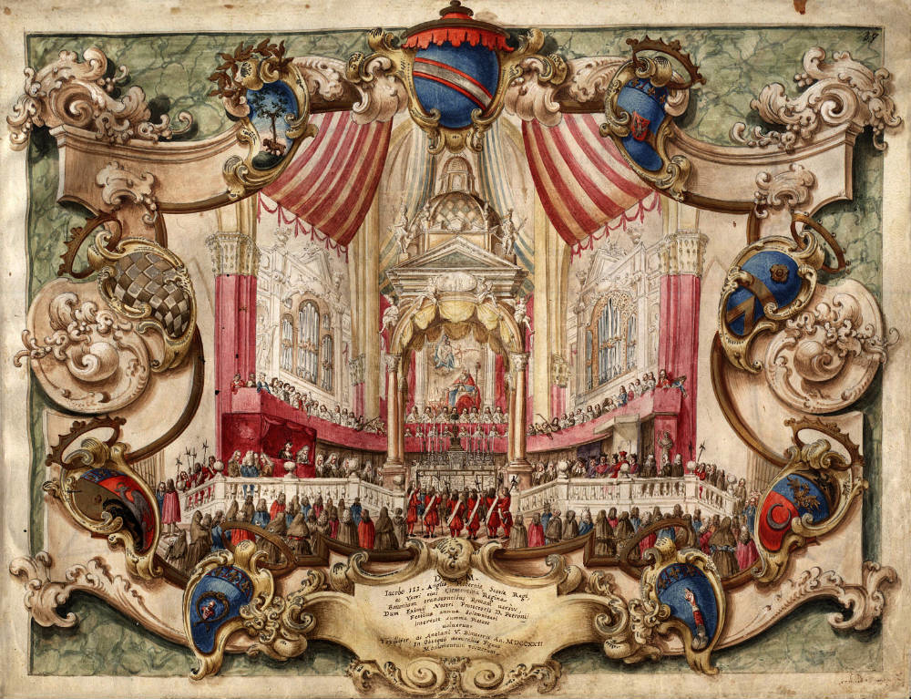 Fig. 11 Leonardo Sconzani, in Le Insigna degli anziani del comune, miniature representing the presbytery of San Petronio during the solemn celebration of the Patron Saint, at the presence of the highest religious and municipal authorities; James III of England, Ireland and Scotland and his wife Clementina. 172215.