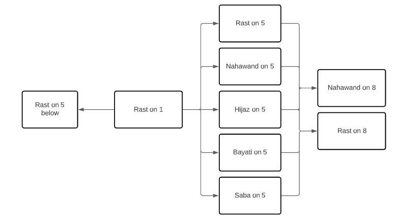 To gain familiarity with the sound of the different ajnas and maqamat, I recommend playing around with them, and slowly broadening your spectrum. For each maqam family I have made an example path to follow during your explorations of the different colours of the maqam. It is highly recommended to set a drone to the root of the maqam you want to practice, so you can always relate the different intervals of the notes to the root of the mode.