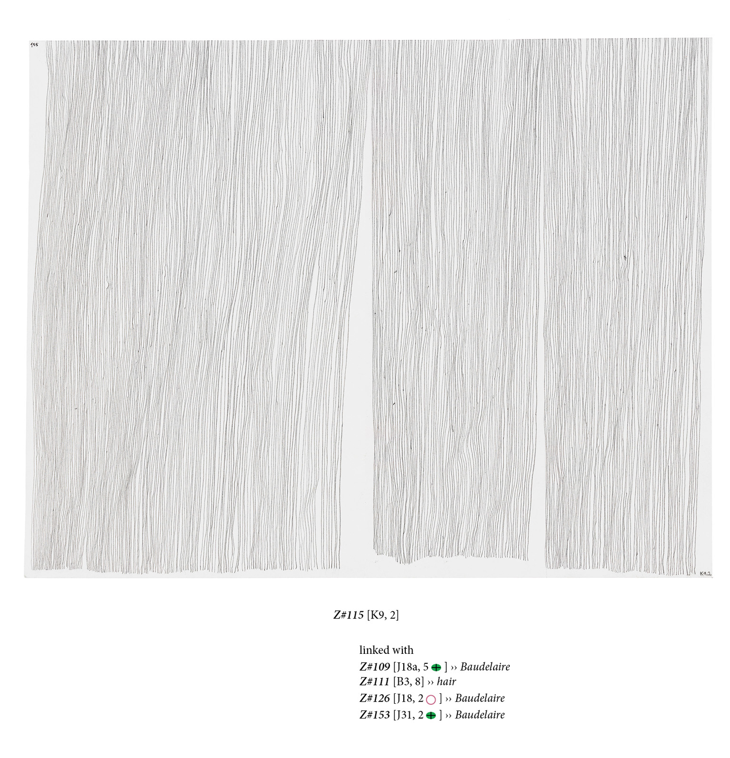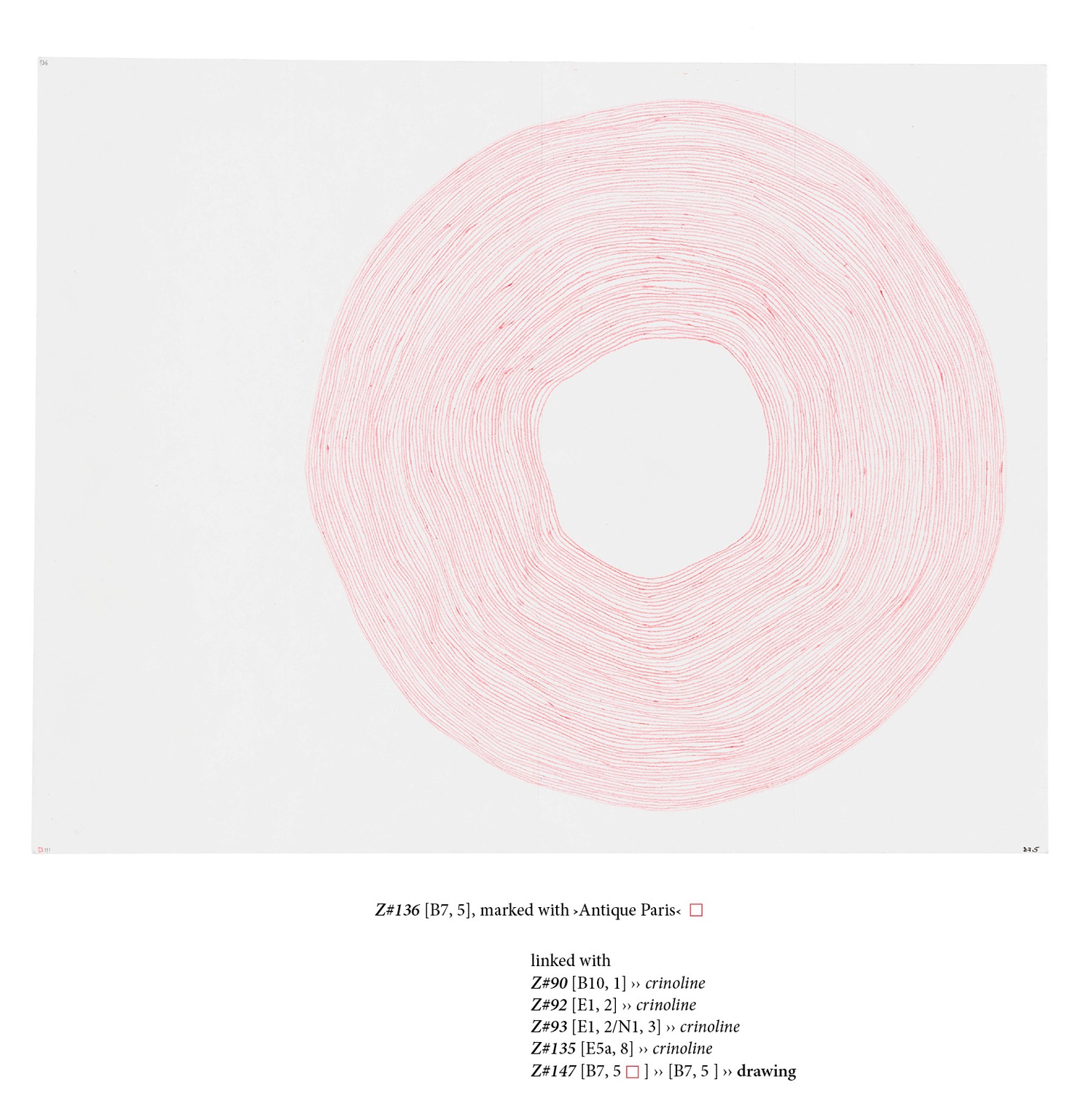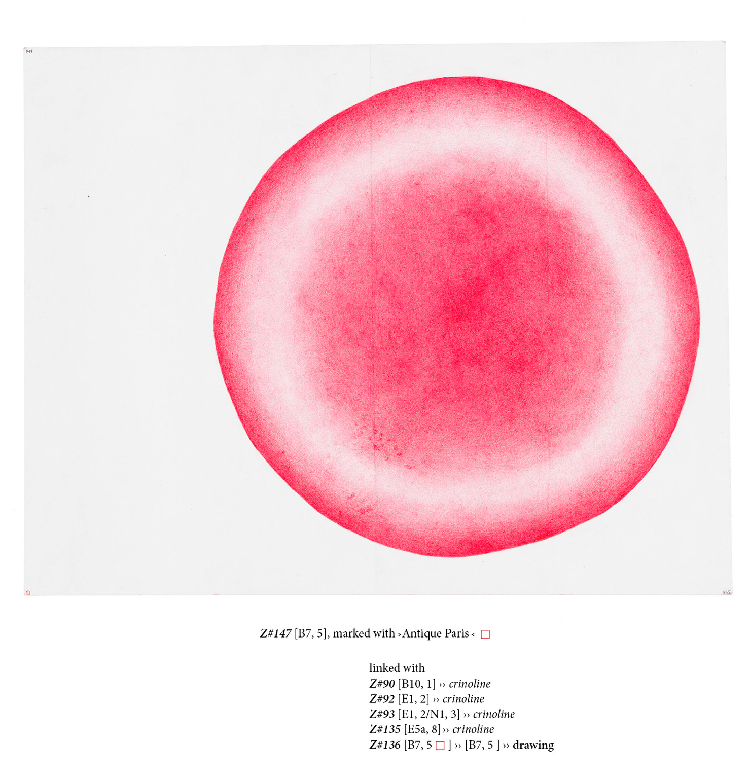 Ever since Patrizia set eyes on the Arcades manuscripts in the Walter Benjamin Archive in Berlin in 2012, she cannot cease reflecting on their unique qualities. The meticulously executed pages and their countless coloured markings appeared to contain meanings otherwise lost in the subsequent editions of the published work. Benjamin created connections within his notes in a number of ways: through the ‘convolutes’ he constructed, through the marks-symbols (see legend of marks below), and through words buttressed by black boxes, inserted the end of certain fragments (see D1,1 on right margin). Emanating from a graphic interaction with the work, a number of projects emerged: Patrizia followed in Benjamin’s footsteps to Paris and translated his coloured symbols into an online digital format: www.benjamin-passagen.de; she also built up a series of over 150 drawings that take up Benjamin’s methodologies.
