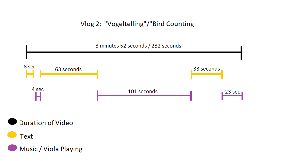 Although in this video had more music than text (see Appendix D), it felt like a perfect balance of vlogging and music. I think the musical performance does not feel as long as it is, due to the three things; firstly the more active viola performance, secondly the different clips of birds and bird counting, and mostly the inner movement of the excerpt itself.