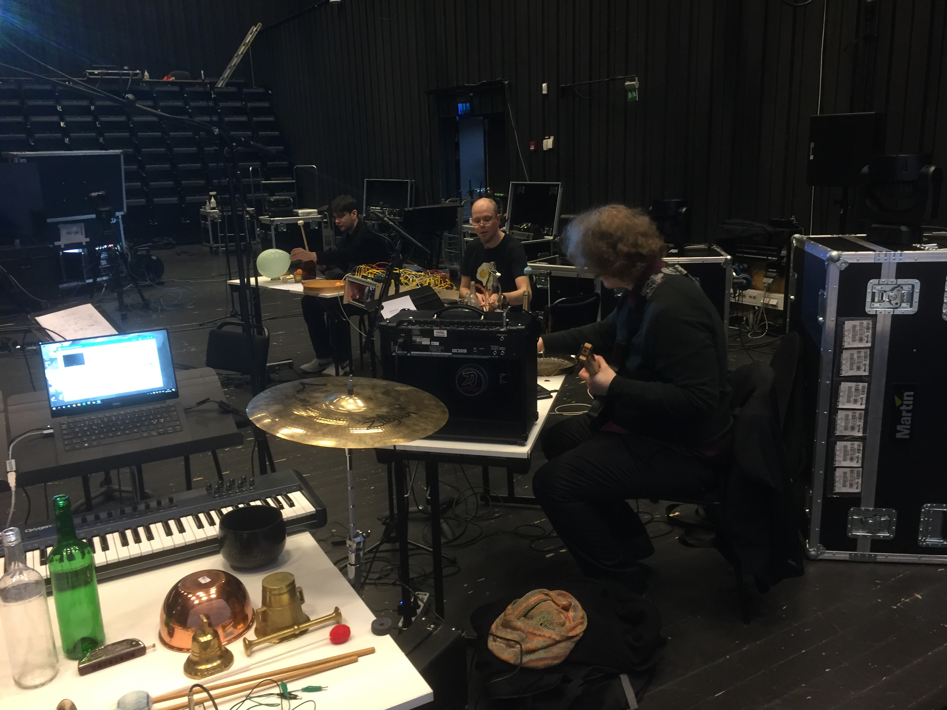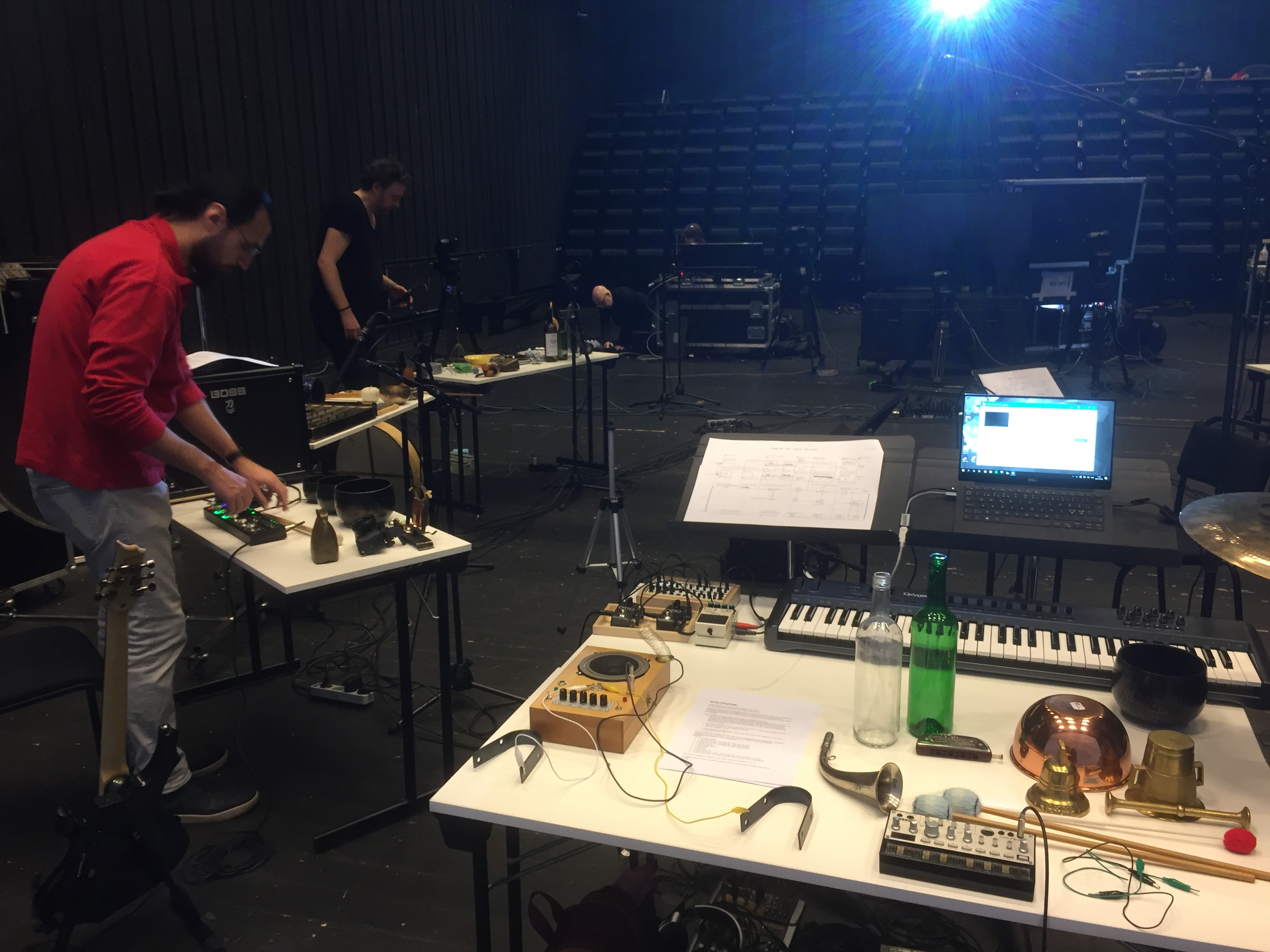 Studio workshop of the final piece together with the instrumentalists: Hans Jonsäll on live electronics, Fredrik Ekenvi on electric guitar and José Louis Relova Gallego on bass clarinet.