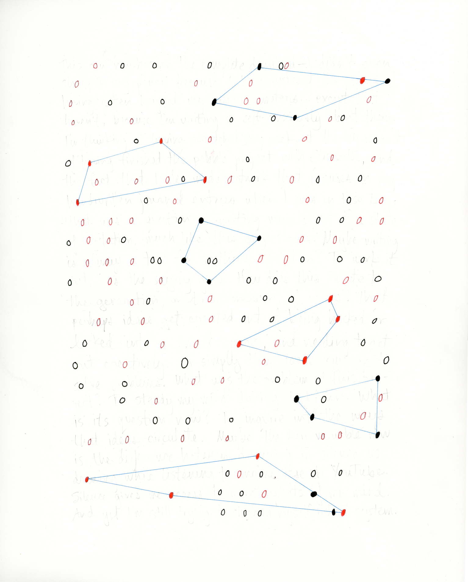 I emphasize the process of ideation not only by erasing the words, but by making obviously idiosyncratic shapes. The shapes may look solid, but their outlines are provisional. I could connect the same dots to form different shapes, or I could connect different dots. No consistent rules govern the process; sometimes one drawing suggests new guidelines for another. Often, I look at an array of dots/data for a long while, without a plan in mind for how to draw the lines, so that an idea can occur to me, and hopefully surprise me.