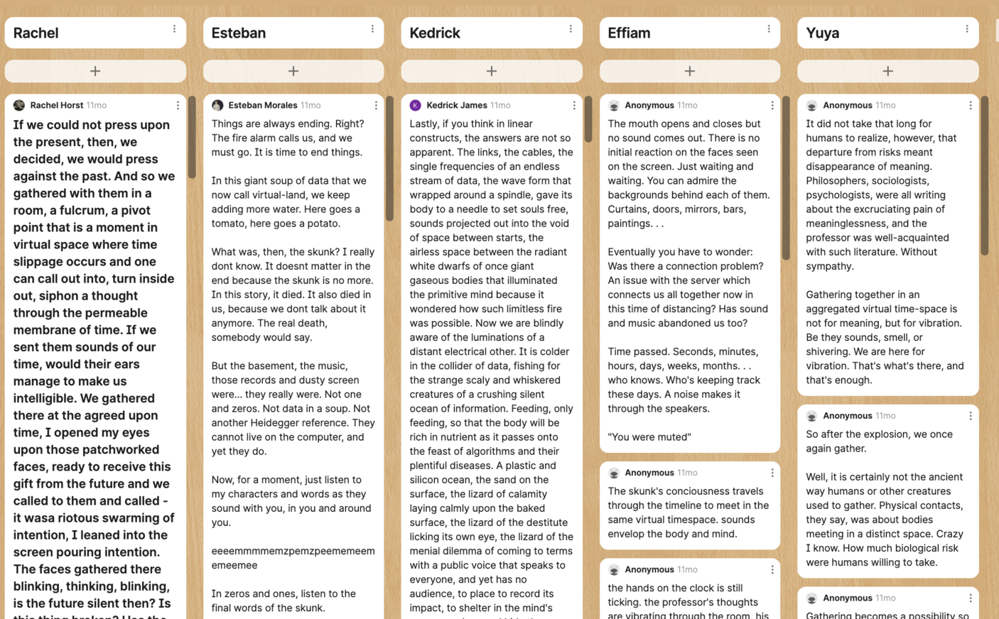 Our experimental writing process is a nesting of arts-based methodologies and digitally mediated creative practices: narrative futuring3, collaborative writing in digital interfaces4, textual sonification using the Singling platform5, Zoom and Padlet as both collaborative interfaces and performance venues, and The Patch, a collaborative writing and performance workshop6. The resulting text/s, Skunk Tales, provides more of an unbounded futures atmosphere that does “atmospheric things”7 than an enclosed and representative short story with a beginning, middle, and end. This bricolage of arts-based, digitally enriched methods has much to offer the qualitative researcher interested in engaging with the unquantifiable realms of the imaginary, and finding/creating emergent and entangled meaning and insight there. Within this exposition we describe this gathering of methodologies that allowed us to create the narrative atmosphere of Skunk Tales.