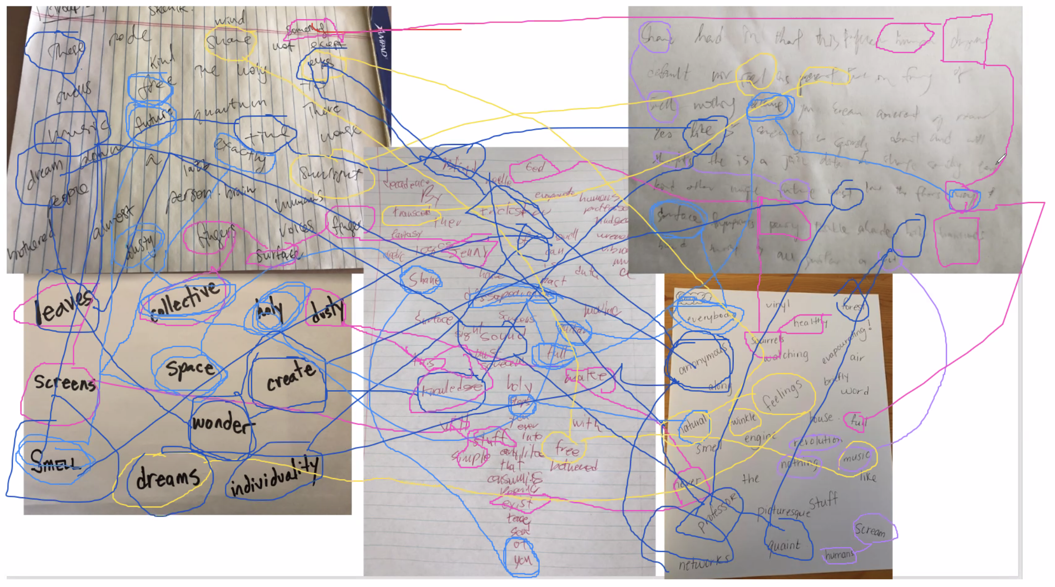 Gathering together the sounds and texts of Skunk Tales into a finalized output was contrary to the methodological processes of the storying. We desired to facilitate generative engagements with our narrative imaginings. The Patch is a writing and data analysis workshop in which participants are led through a series of creative collaborative engagements with textual data. Due to lack of space here, we cannot explain the rich digital and analogue processes of the Patch Workshop. We wish to briefly mention the creative students in a graduate course, Digital Methods in Literacy Research, who contributed their poetic interpretations of the textual data of Skunk Tales. In a virtual workshop with these students, we took up the text of Skunk Tales, scrambled, mixed, and remixed the narrative thus obliterating any semblance of linearity, and facilitated collaborative poetic interpretations of the data. The resulting collaborative poems and collaborative performances are another chapter of Skunk Tales, thus extending the nexus of our compositional intent.