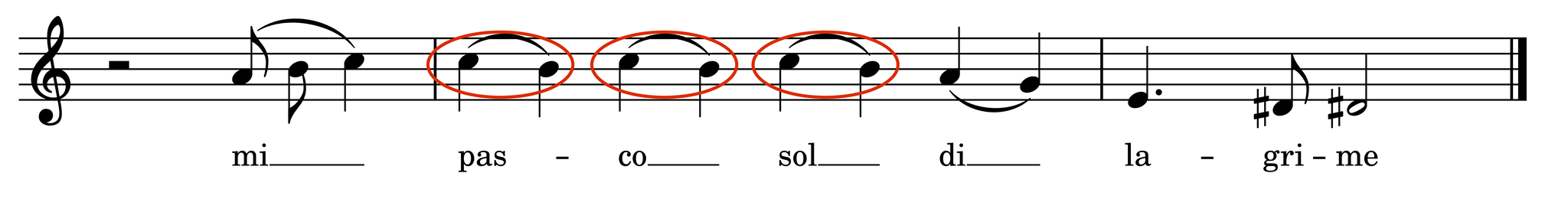 Motivic tears, wails, cries, and the like are clearly featured in the “Lamento d’Arianna”, “L’Eraclito amoroso”, “Lagrime mie”, and the Laments of Filia. “Lamento d’Arianna” has two distinct versions of wails and sighs: the first a pained expression of overwhelming grief, and the second a remembrance of her love for Teseo. The grief-fueled wails are created with a dissonant ascending chromatic line stretched over a single syllable and appear several times within the Lament.