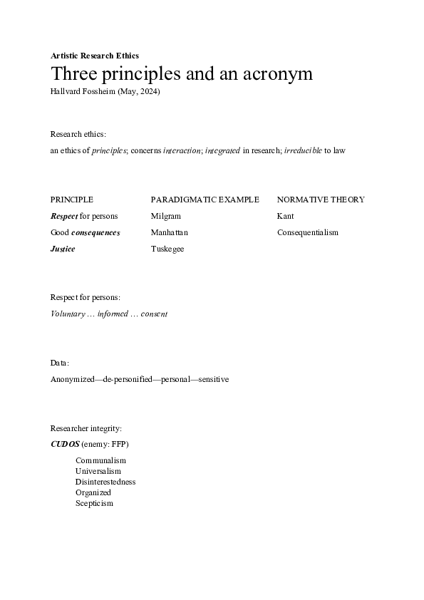 In this talk, Hallvard Fossheim will give a brief sketch of the basic principles for research ethics: respect for persons, good consequences, justice, and researcher integrity. These principles are general and of course in need of careful and good judgment in each case, but they are also very helpful, in that they remind us of what is at stake ethically in a wide range of research related situations. A primary focus will be on respect for persons (among the so-called external principles) and integrity (among the internal principles).
