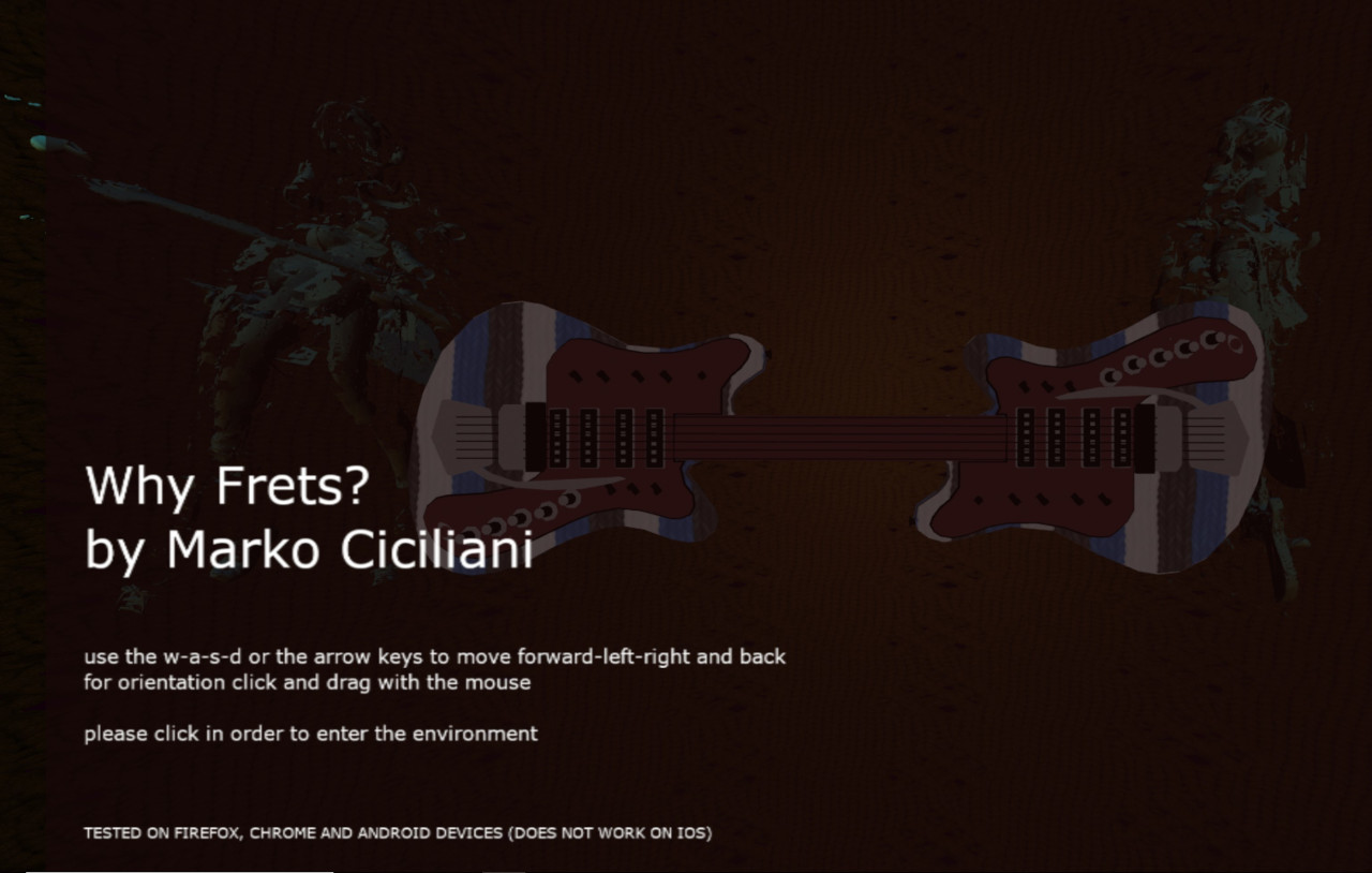 After arriving on a landing page a penetrating sound is audible at 50Hz, typical of a hum of an electric guitar. Once the landing page is clicked on it fades out and the pitch unfolds to a harmony which is timbrally modulated. The first object that the user encounters in the virtual space is an object called the 'siamese guitar', which consists of two guitar bodies that are sharing the same neck.
