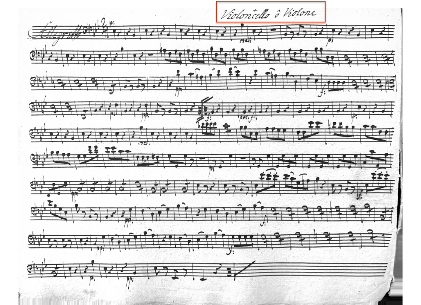 The interchangeable usage of the terms violone, violoncello, and basso is demonstrated in the following examples. One such example is the Divertimento in G composed by Johann Baptist Vanhal, which is suitable for performance by a combination of violin, viola, and either a violoncello or a violone. This illustrates the fluidity and flexibility in the designation of these instruments in the musical context of the 18th century (Figure 50).