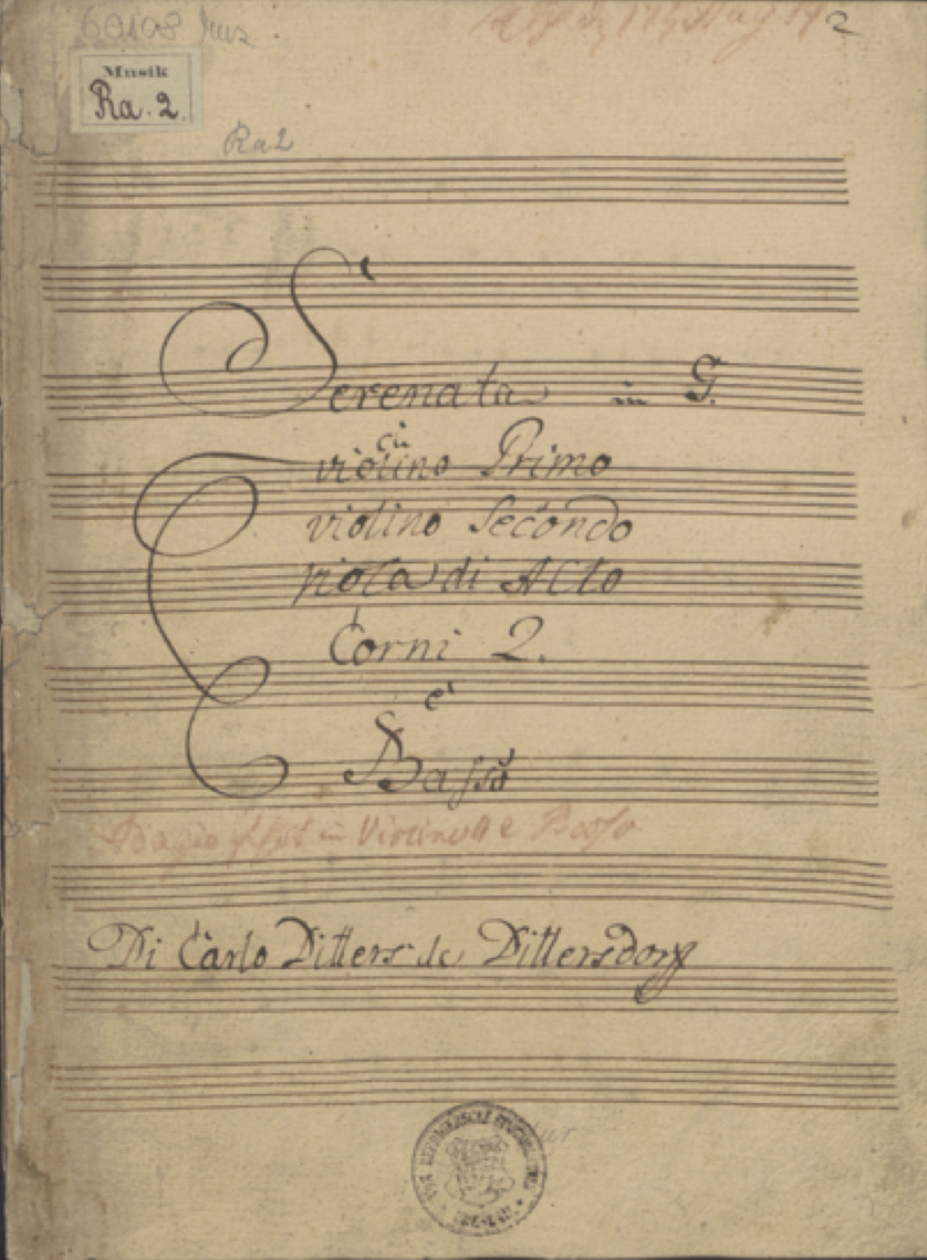 Fig. 15 Carl Ditters van Dittersdorf, Title page and bass part, Serenata in F, Prague, Národní knihovna Ceské republiky (CZ-Pu) XXXII-A-558