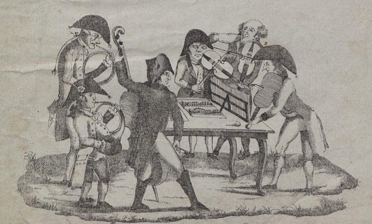 Aside from the title page of a print of Mozart's Ein Muskalischer Spaß KV 522 (Vienna: André, 1797), I could find no other iconography depicting a Divertimento Sextet. However, there are pictorial examples from the 18th century that show ensembles performing outdoors with the double bass serving as the only bowed bass instrument.