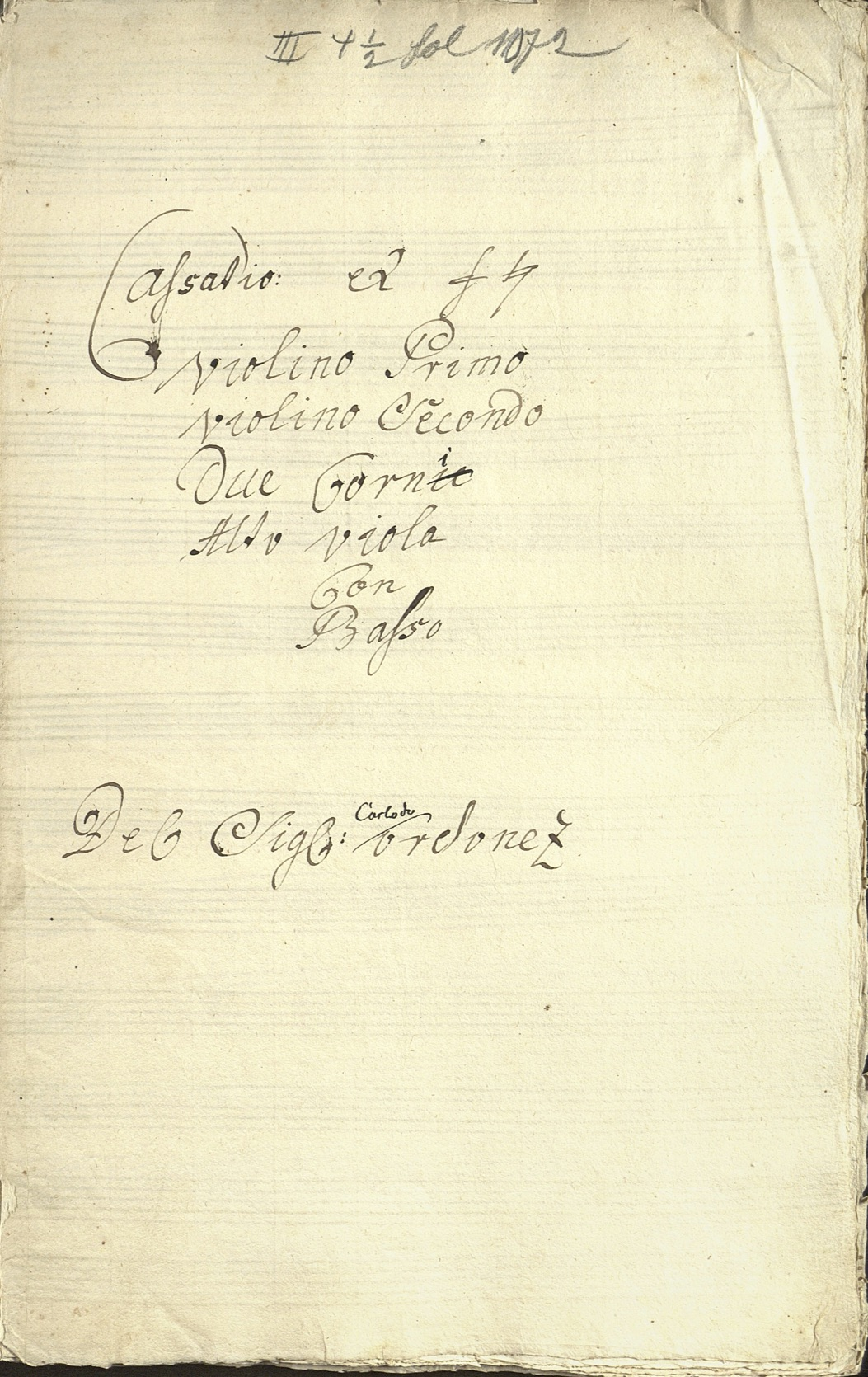 Carlos d'Ordoñez (1734-1786) was a minor composer living in the era of Mozart and Haydn. While his full-time profession was as an administrator at the Lower Austrian Regional Court, he also played the violin in the Kaiserliche Kammermusik and the Tonkünstler-Societät. He composed several symphonies, string quartets, and divertimentos. The example provided here is of a piece that shares the same instrumentation as the Divertimento Sextet. During my research, I found manuscripts of the piece in three libraries under different titles: ‘Sextetto Concertino’, ‘Concertino’, and ‘Cassatio’ (Figure 43). Notably, all three versions had the term ‘Basso’ featured on their title pages and bass parts. The bass part of the piece does not extend lower than F1, which is also the lowest note playable on a 5-string Viennese bass. Given the fact that F1 is the lowest note, this does not necessarily mean that the piece was specifically composed for this instrument. Other factors, such as the key of the piece, can also affect the range of the bass part.