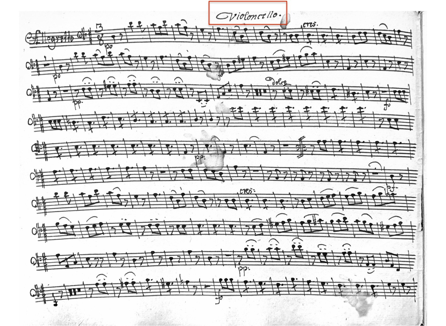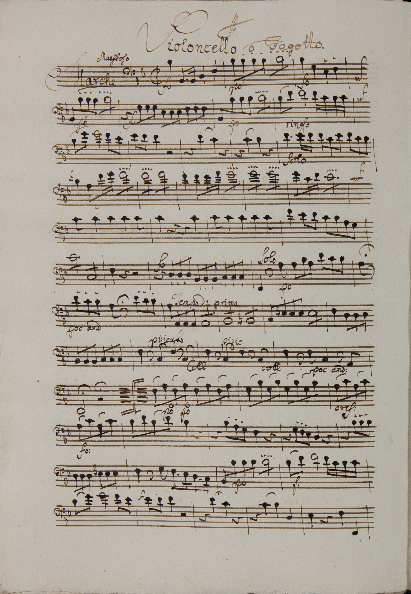 It is interesting to note that the violoncello part in question is entitled "Violoncello ó Fagotto", which suggests that it was originally intended for the violoncello but was later adapted for the Fagotto (bassoon) as well. The use of the word ‘ó’ in the title, which is Latin for ‘or’, further supports this idea. Also, the fact that the writing seems to be by a different hand could indicate that the piece was popular or flexible enough to be adapted to different instrumentation. Further research into the history and compositional origins of the piece could possibly shed light on the reasons for this adaptation and the cultural and musical context in which it took place (Figure 32).