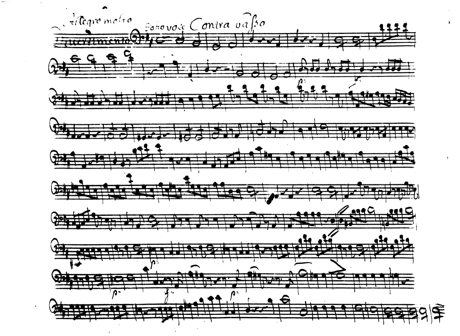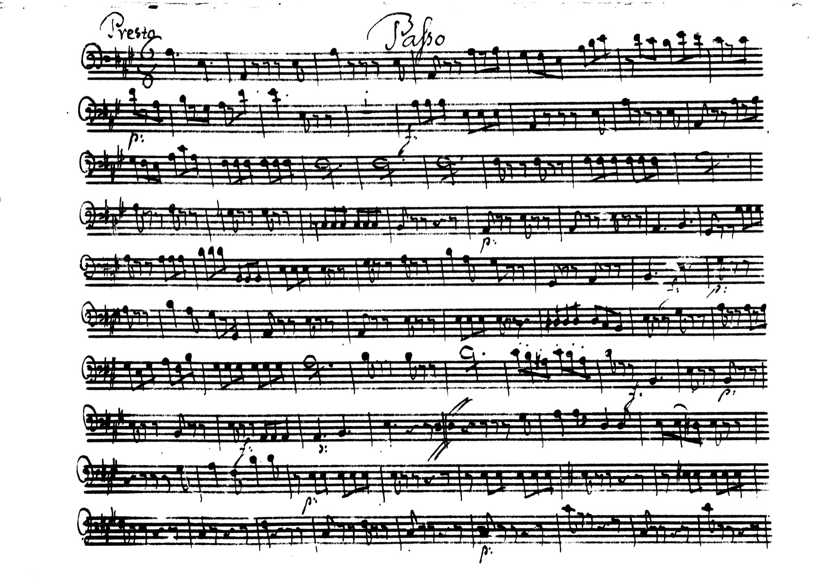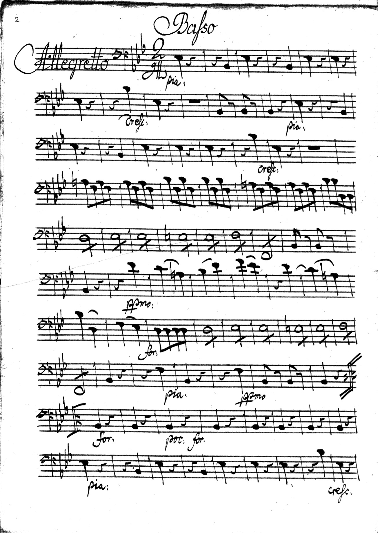 An example of a composition written for the Divertimento Sextet instrumentation is the Cassatio in D major by, Johann Baptist Vanhal, which is housed in the library in Prague. The manuscript uses the term ‘Basso’ on both the title page and bass part, but this does not necessarily indicate that the piece was written specifically for the double bass. The bass part is relatively simple and does not extend below G1, which is within the range of the double bass. However, it's worth noting that the key of the piece might have influenced the range of the bass part, and thus, the specific instrument it was intended for cannot be determined with certainty (Figure 41).