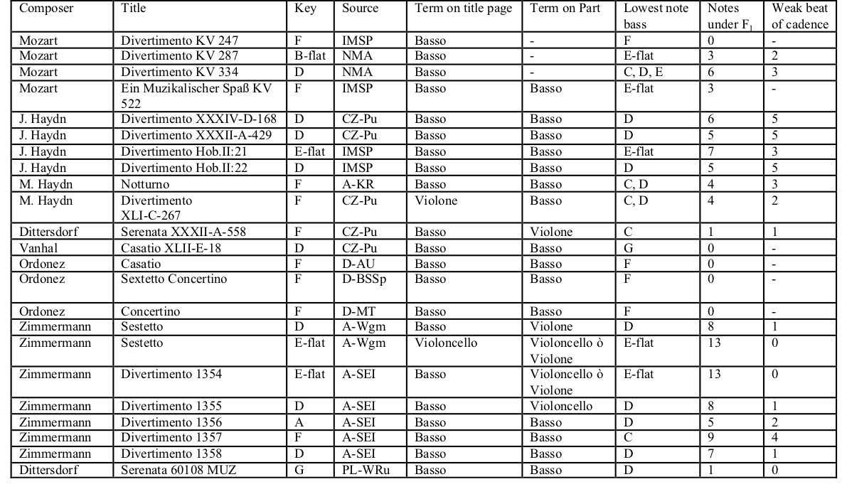 Through examining these manuscripts, I have made a number of observations that will help me conclude whether the double bass could have been the standard bass instrument in the Divertimento Sextet. I have noticed that there are a variety of titles used for divertimentos, even for the same piece. Additionally, since the lowest note of the double bass in 18th century Austria was either F1 or E1, it was essential to examine the manuscripts to see how the bass part behaved in relation to notes lower than the range of the double bass. I have come across works in which the term Violone appears on the title or in the bass part in which the bass line extends lower than the range of the double bass, practically all on the weak beats of a cadence, raising the question if this could have been a “composer's slip of the pen”. I have also found works with only Basso on the title page and bass parts with notes extending lower than the range of the double bass. Further there were works with only Basso on the title page and bass parts with notes not extending lower than the range of the double bass. This does not necessarily mean that these pieces were specifically written for double bass, but that the notes could have stayed in a certain range due to the key in which the piece was written. I have discovered compositions with Violoncello ò Violone in the title page or on the bass part, as well as manuscripts from various libraries in which one source refers to the work as Violoncello and another as Violone, indicating that either instrument may be suitable for performance of the piece.